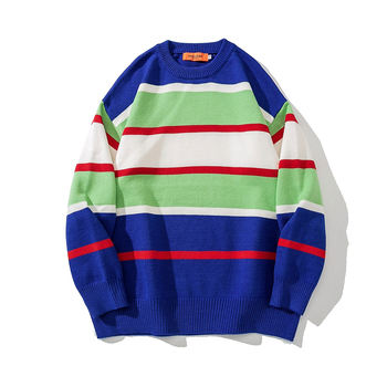 American Retro Oversized Contrasting Striped Knitted Sweater Men’s Women’s Casual Round Neck Patchwork Pullover Sweater Big Size