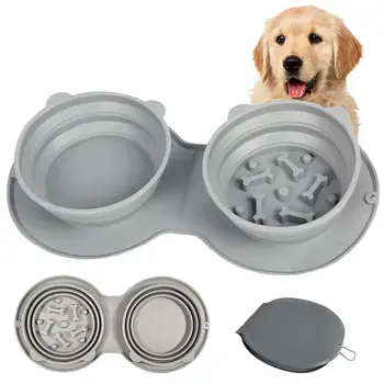Collapsible Dog Bowls, Portable Silicone Twins Dog Bowl for Slow Feeding, Foldable Adjustable Pet Food and Water Feeder Bowl