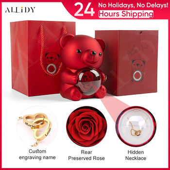 Allidy – Real Eternal Red Rose Teddy Bear Custom Name Necklace Jewelry Set Gift Box Christmas Valentine’s Birthday Wedding Gift