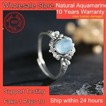Vintage 925 Sterling Silver Aquamarine Ring 7x5mm Oval Natural Gems Adjustable Floral Shaped Design Handmade Bohemian Jewelry