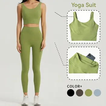 Seamless Yoga Set Women Lycra Gym Clothing Sports Bra Semi-Fixed Cups Workout Tops Anti Rolling Yoga Leggings with Pocket Tights