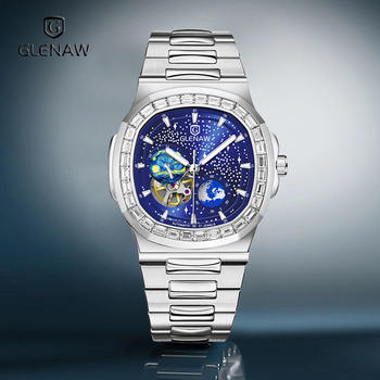 GLENAW Brand Men Watches Waterproof Luminous Automatic Mechanical Watch Double-second Travel Time Rotating Earth Starry Sky Dial