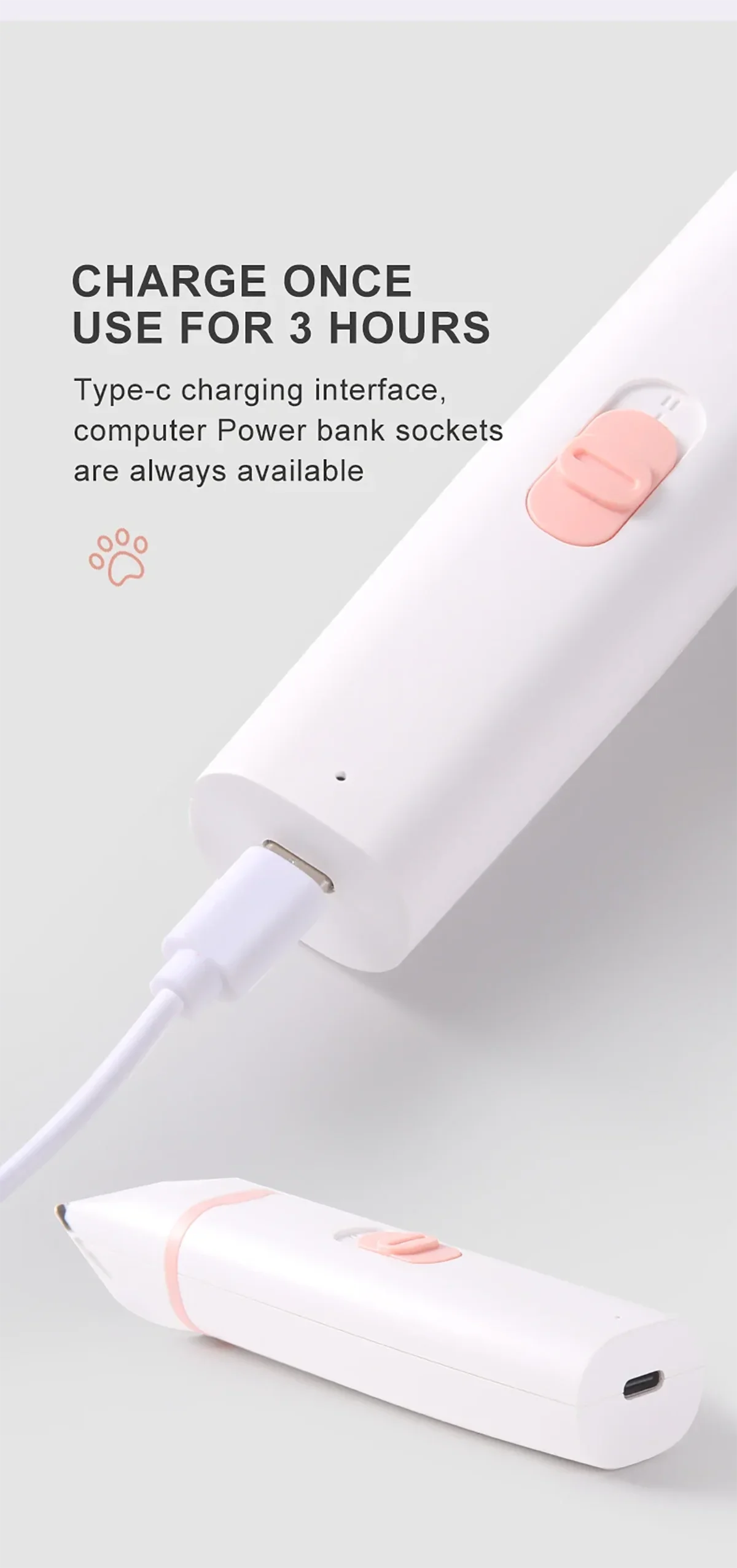 【TYPE-C Charging】This dog hair clipper has a built-in 1000mah rechargeable battery, and the TYPE C charging port allows you to complete charging in a variety of scenarios, such as computers, laptops, mobile power, etc. Only 1.5 hours charging can be used continuously for 3 hours.