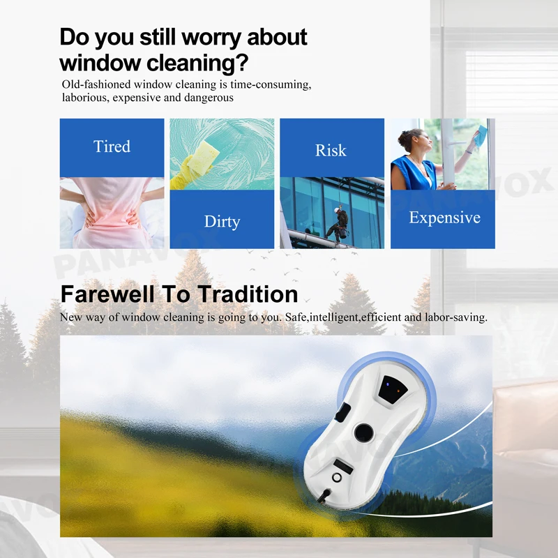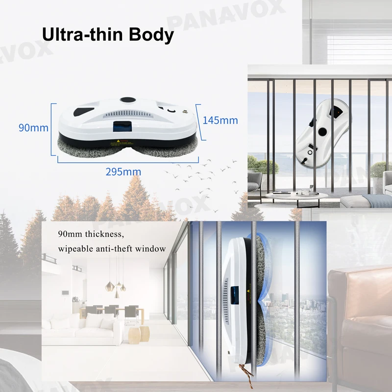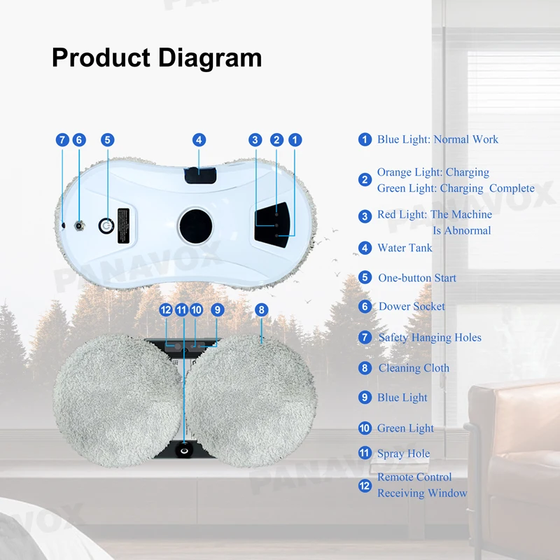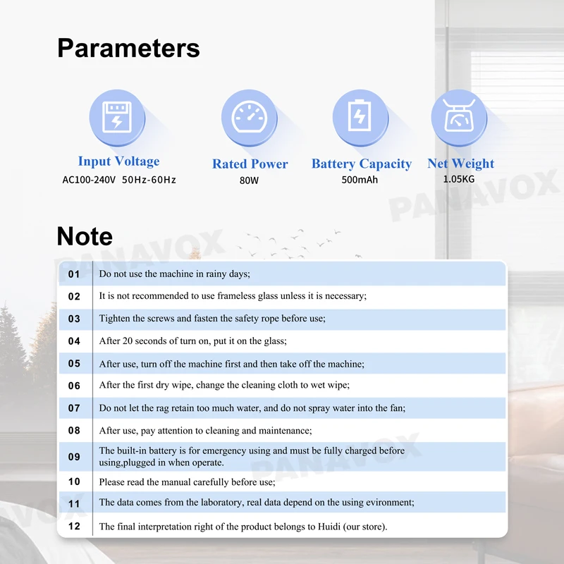 Note:. The machine must work in the plug state. The battery inside is a preventive task that prevents electricity from suddenly breaking and falling. For safety reasons, you must wear a safety line when washing windows. The covering must be pressed flat, if you can’t spray water, you can wipe the water with a towel.