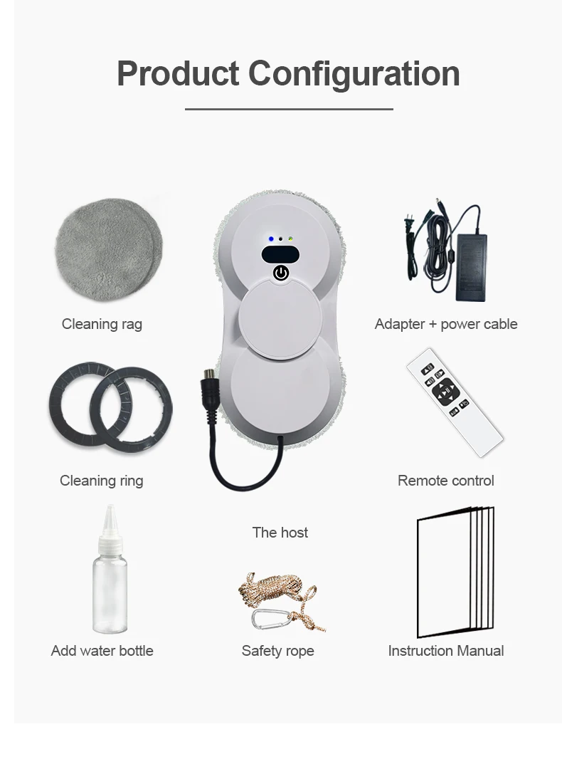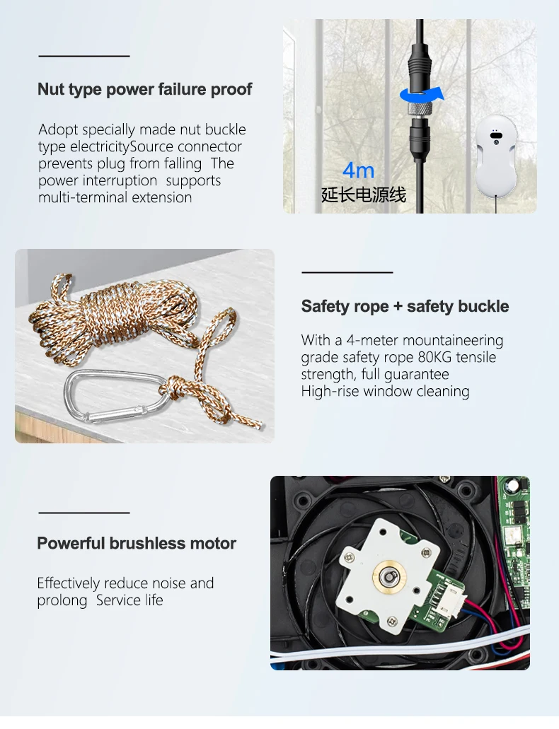 Note:. The machine must work in the plug state. The battery inside is a preventive task that prevents electricity from suddenly breaking and falling. For safety reasons, you must wear a safety line when washing windows. The covering must be pressed flat, if you can’t spray water, you can wipe the water with a towel.