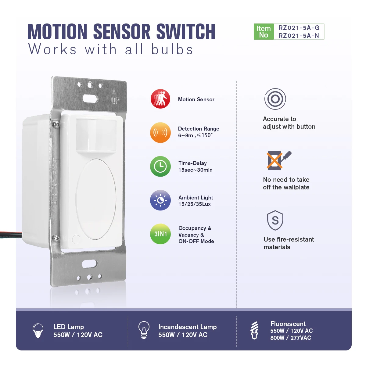 The wall-mounted switch automatically turns the lights on when you enter the room and turns them off after you leave. Keep saving energy and automate the lights in your home with the RAYZEEK occupancy sensor switch, which is ideal for laundry rooms, closets, bathrooms, or bedrooms, and so on.