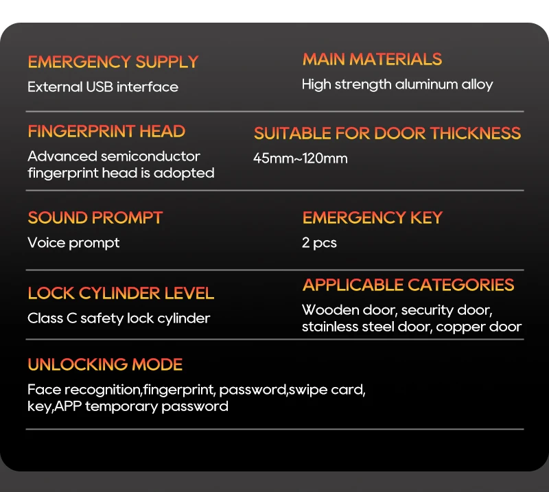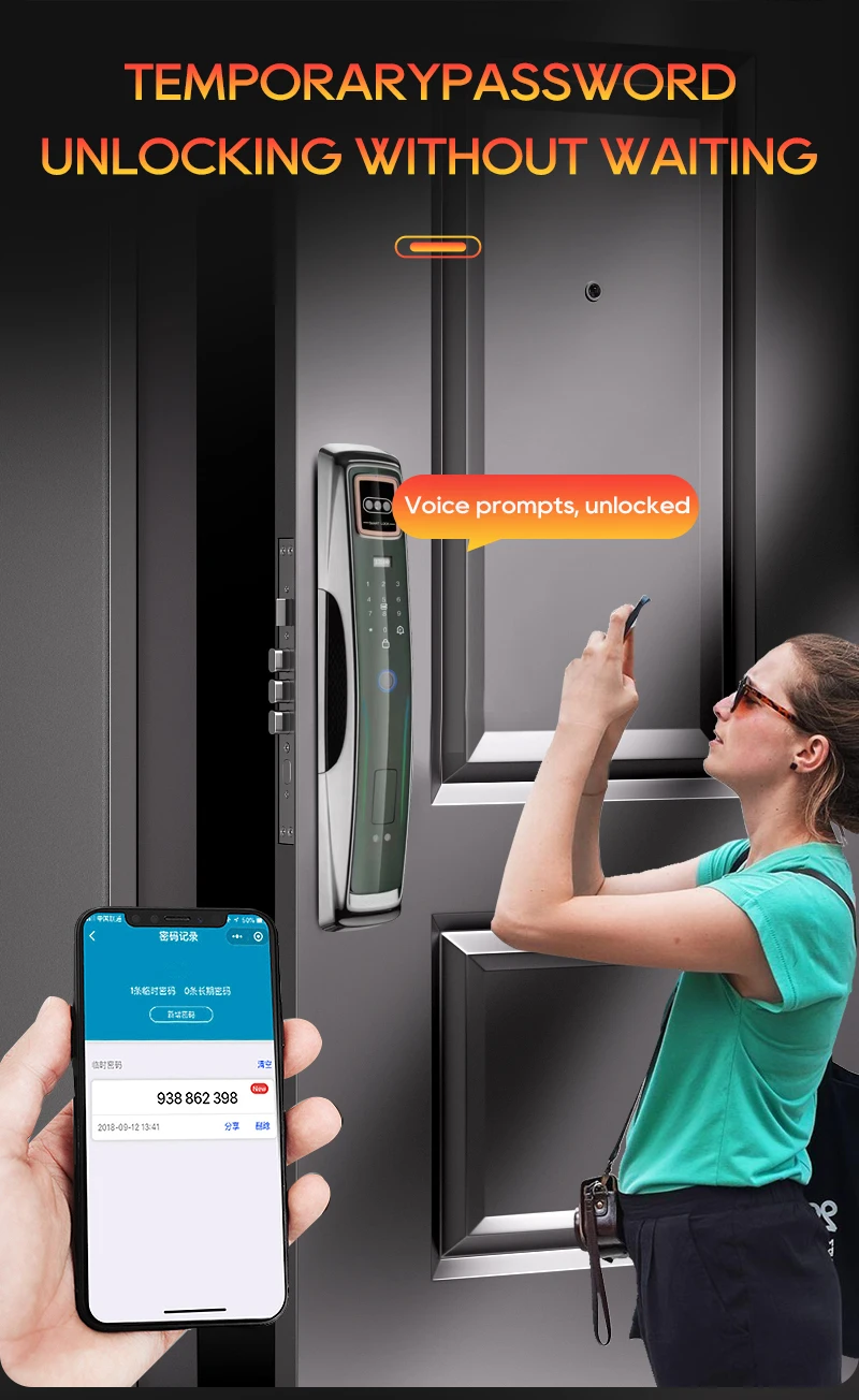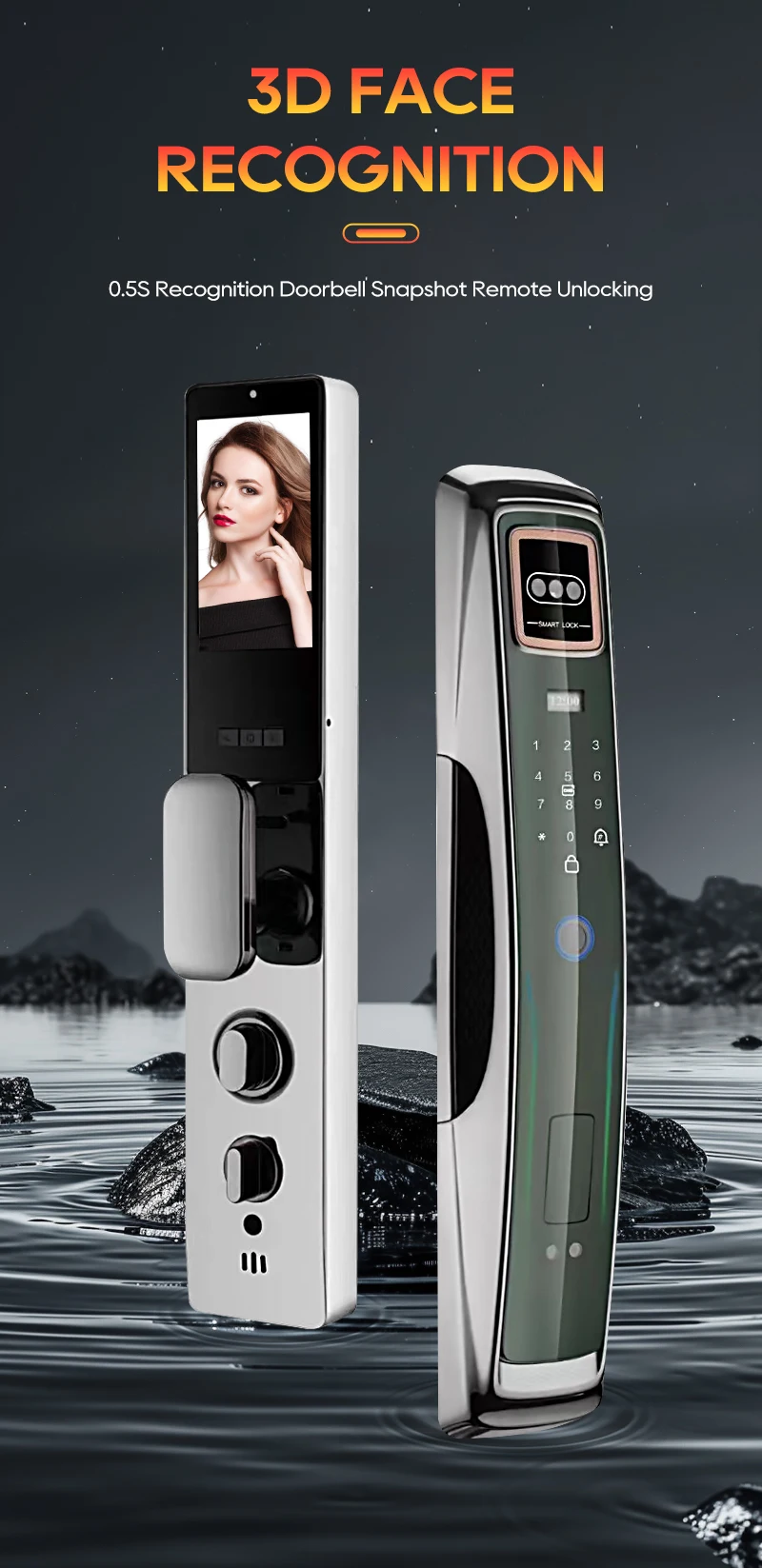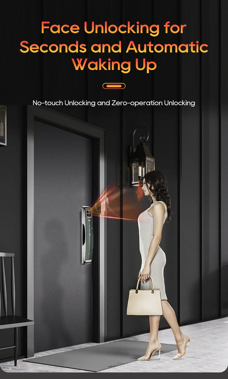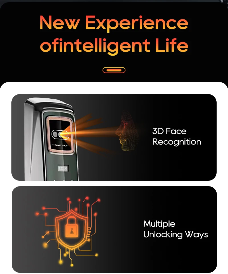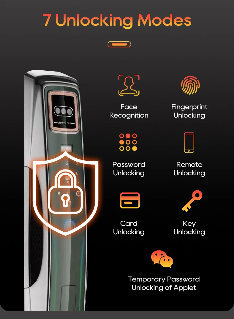 1. 6 unlock ways: 3D infraed Face,Fingerprint, Password, IC Card, Mechanical Key ,APP;