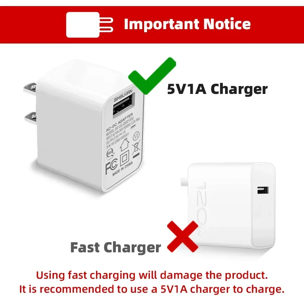 2. You need to use a 5V1A charger, do not use fast charger.
