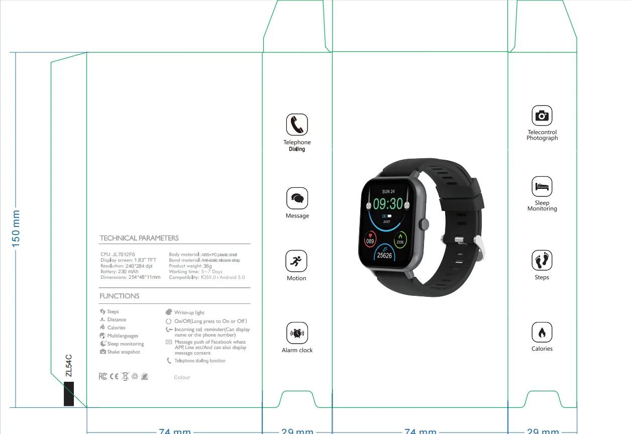 | Outlook & Materials (product shape and materials) | Plastic ABS + PC case + anti-static silicone strap | |