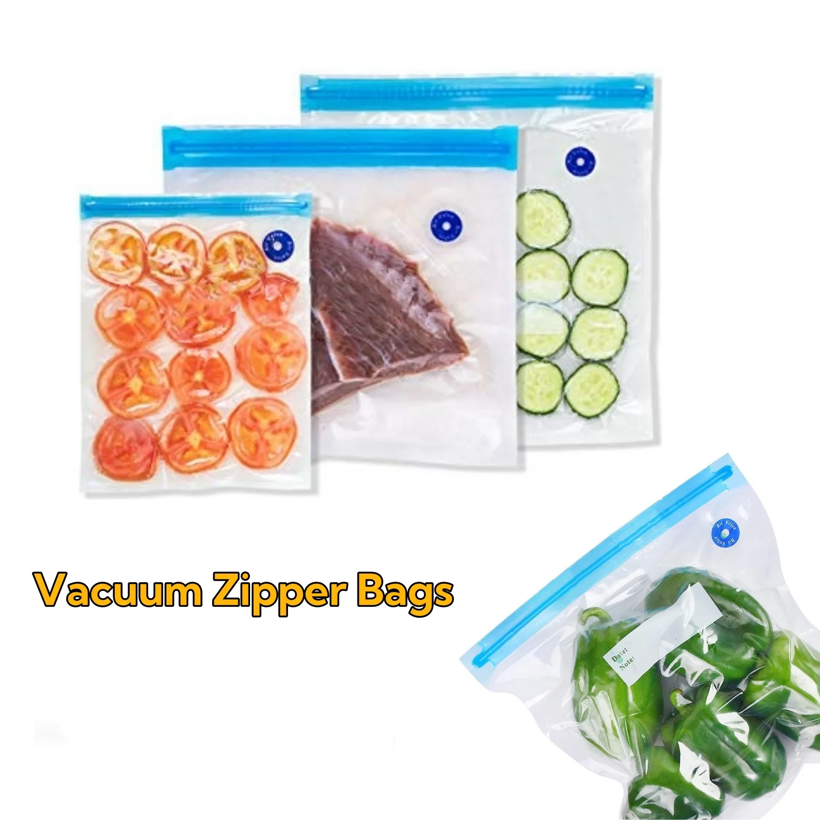 VACUUM SLEAER ZIPPER BAGS – Bag Size: 11.0 x 10.5″; Volume: 2.9L; Material: PA+PE; Care: Freezer Safe, withstands temperature up to 100℃, handwash only; Package Size: 10.1 x 7.3x 1.1 “, 1.2 LBS