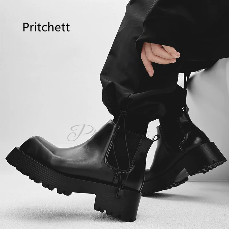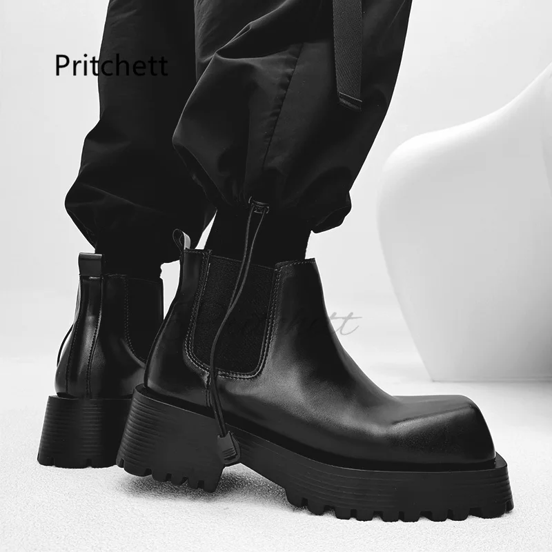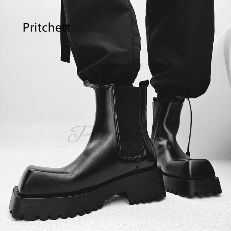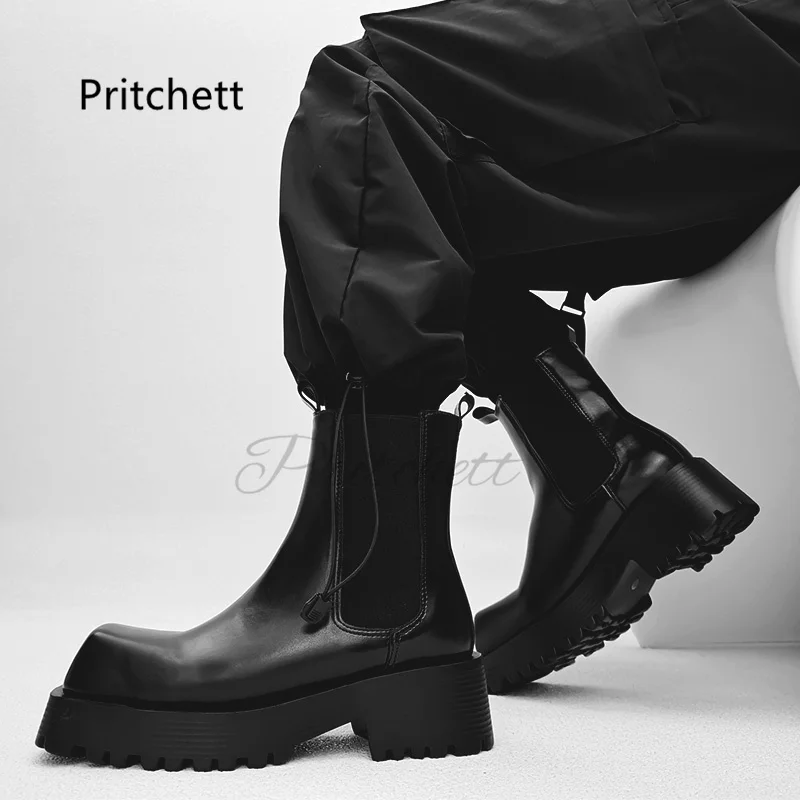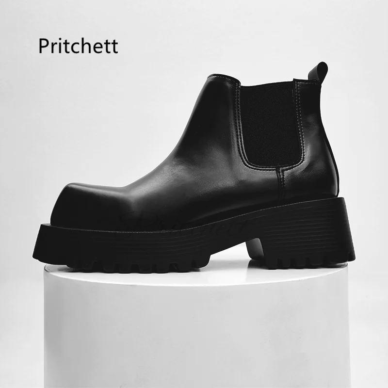 Square Toe Chelsea Boots for Men and Women Couple High Top Shoes Knight Boots Med Heel Chunky Platform Motorcycle Ankle Boots