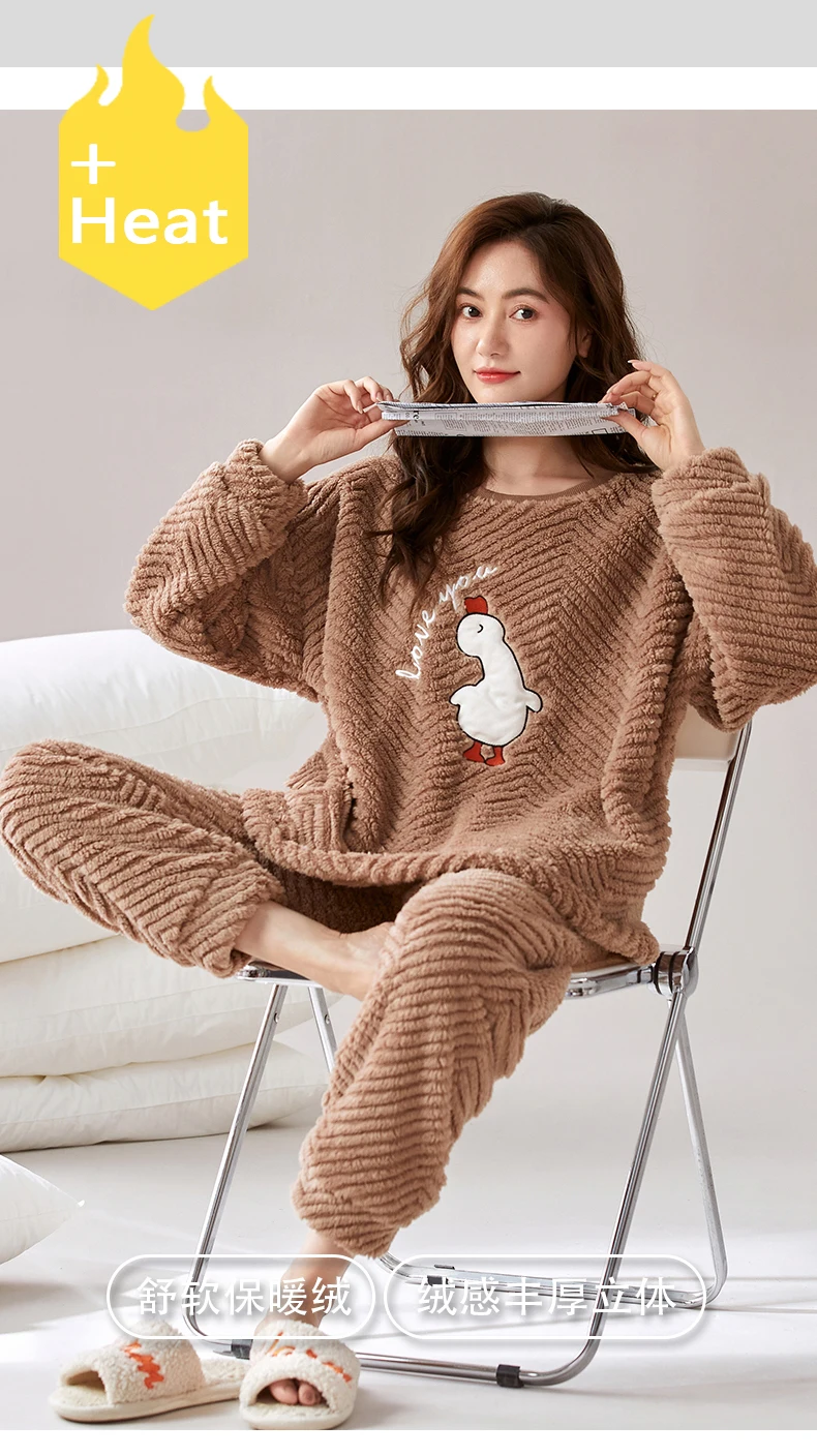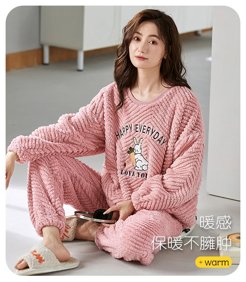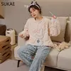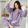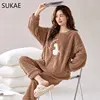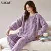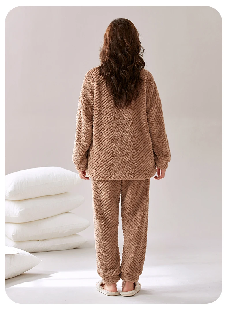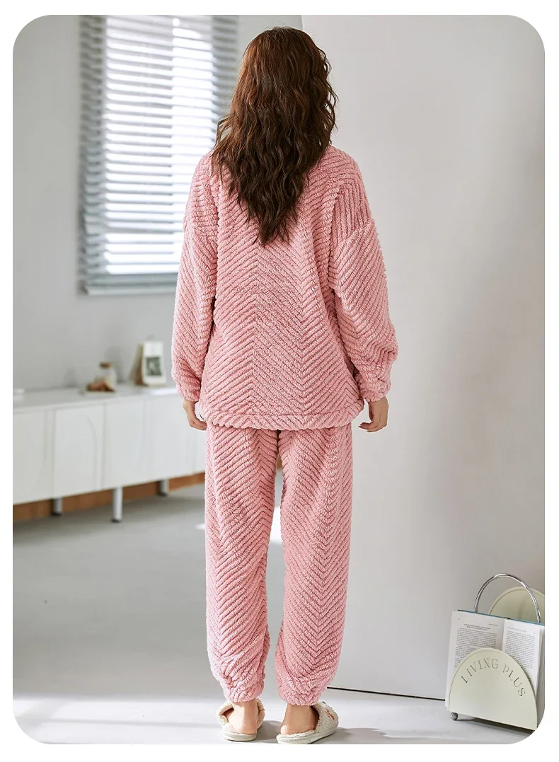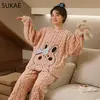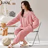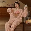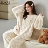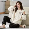 SUKAE Winter Woman Pajamas Set Long Sleeves Fluffy Herringbone Thick Coral Fleece Sleepwear Teddy Homewear Girl Velvet Pijamas