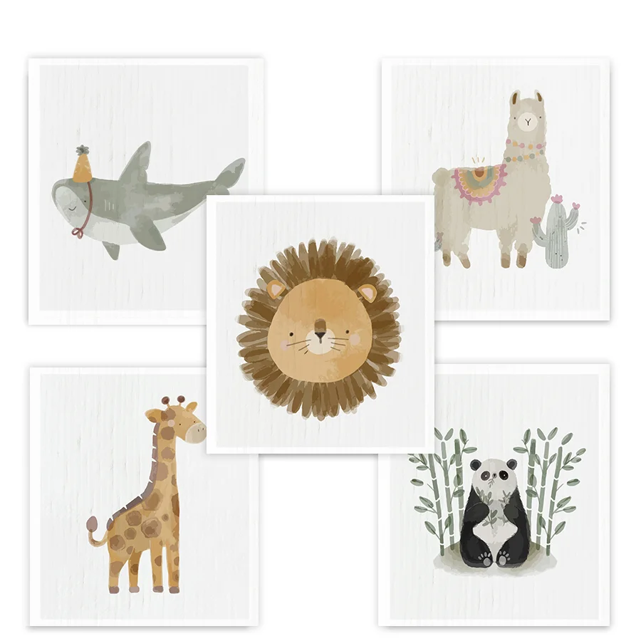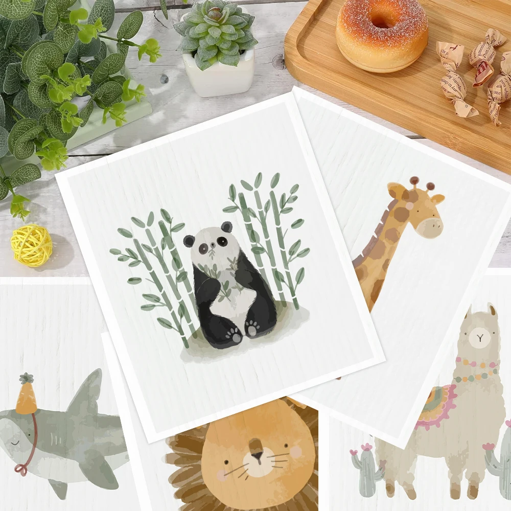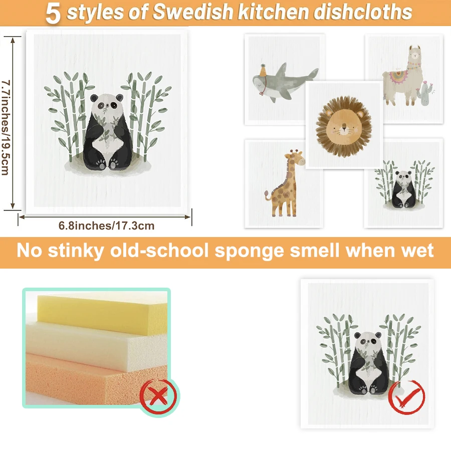 Swedish Dishcloths for Kitchen 5 pack animal series 9 Cloths Reusable Washable Wood Pulp Fiber