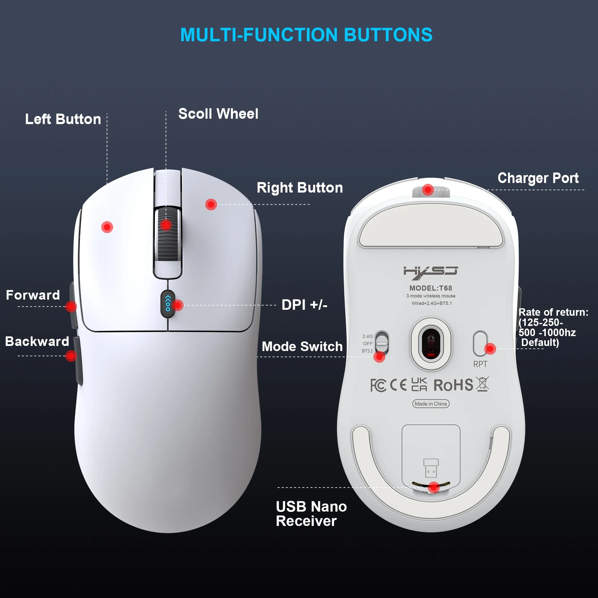 Turn down the power switch at the bottom of the mouse to the BT state ,The blue light flashes quickly to search for the Bluetooth name “T68 BT5.1 Mouse” and connect it. If the blue light flashes slowly in Bluetooth mode, please press and hold the DPI button for 3 seconds to activate Bluetooth. The blue light will change from slow flashing to fast flashing, and you can search for “T68 BT5.1 Mouse”. Connect and use it.