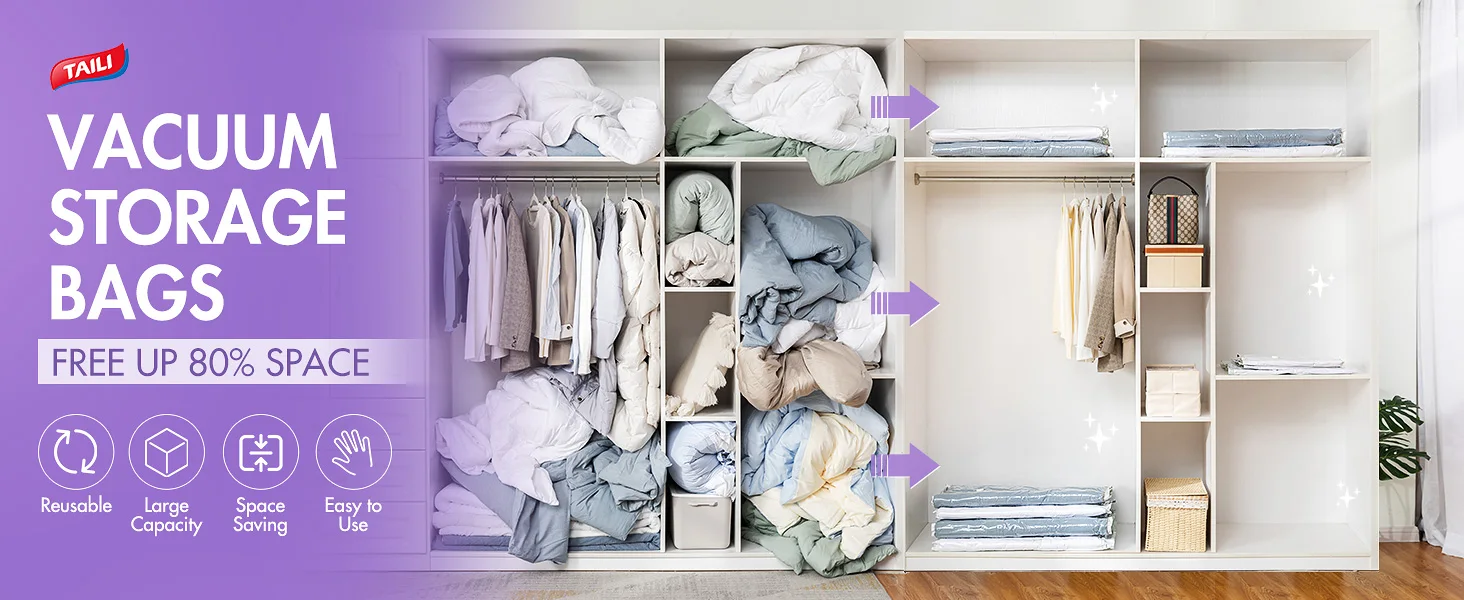 • Multi Work Methods: Using vacuum seal bags for clothes are suitable with most vacuum cleaners in the market, also can be used to compress and exhaust by a pillow, realize the freedom of various air extraction tools.