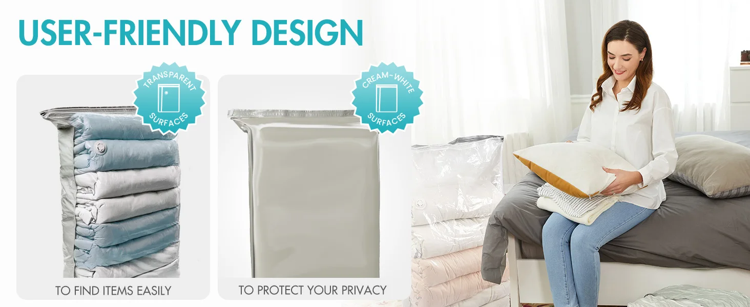 • Multi Work Methods: Using vacuum seal bags for clothes are suitable with most vacuum cleaners in the market, also can be used to compress and exhaust by a pillow, realize the freedom of various air extraction tools.