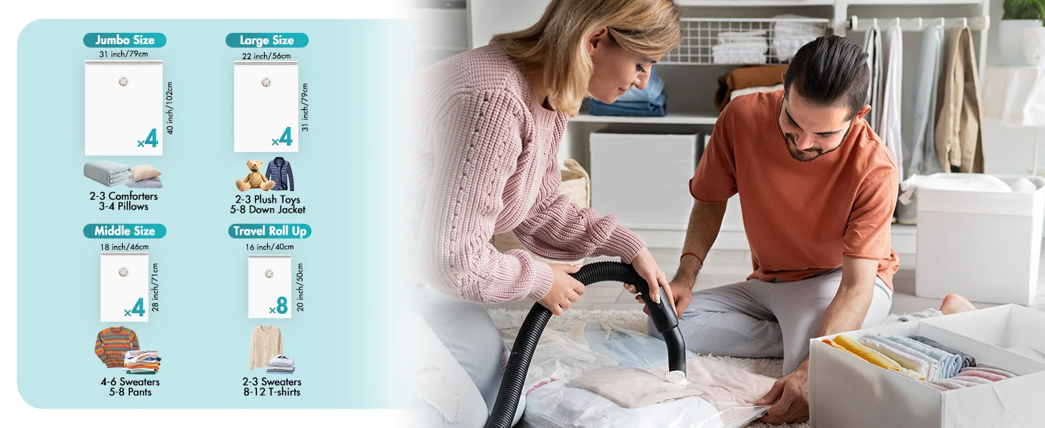 • Multi Work Methods: Using vacuum seal bags for clothes are suitable with most vacuum cleaners in the market, also can be used to compress and exhaust by a pillow, realize the freedom of various air extraction tools.