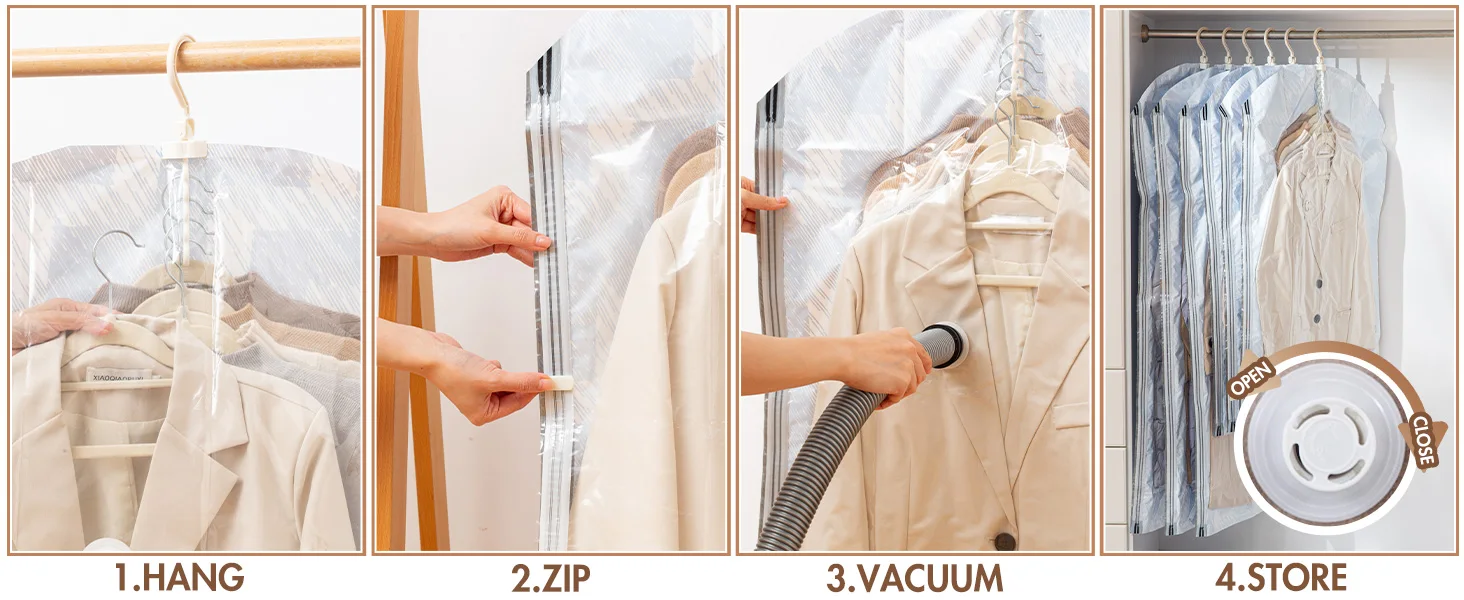 • Upgrade Pro Air Valve: The vacuum pack hanging clothes bags are equipped with upgraded patented air valve, which is suitable for any kind of vacuum cleaner. The transparent body of the hanging vacuum storage bags and the double color zipper allow you to see the sealing and venting effect more intuitively