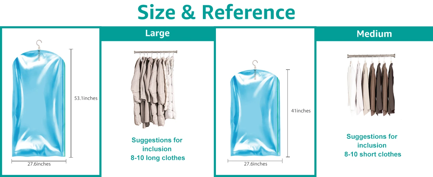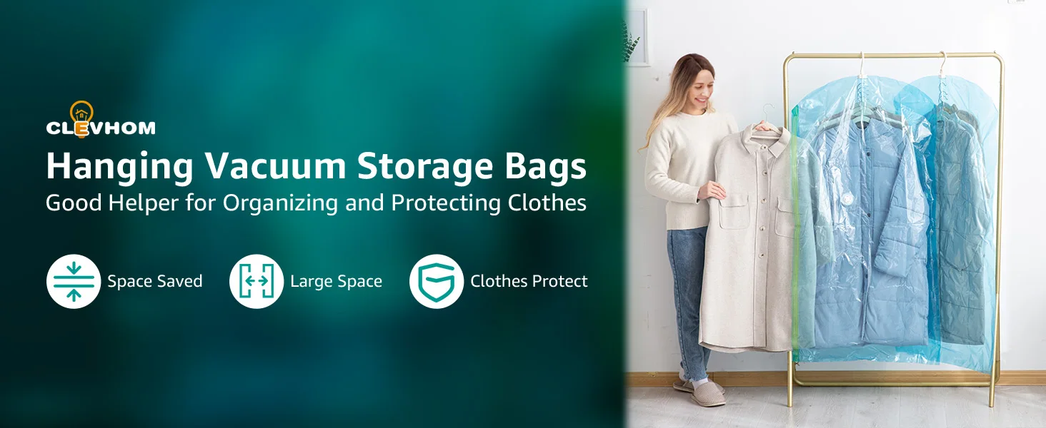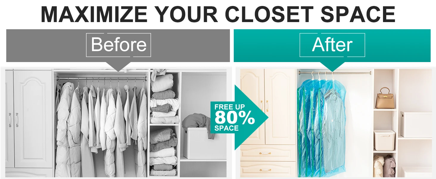 [Closet Storage and Organization]: Save up to 80% of Wardrobe space, with our hanging vacuum bags, you can hang up to 5 pieces of clothing, including jackets, suits, and coats, in one bag and removing air from vacuum bags to reduce their 80% original space.