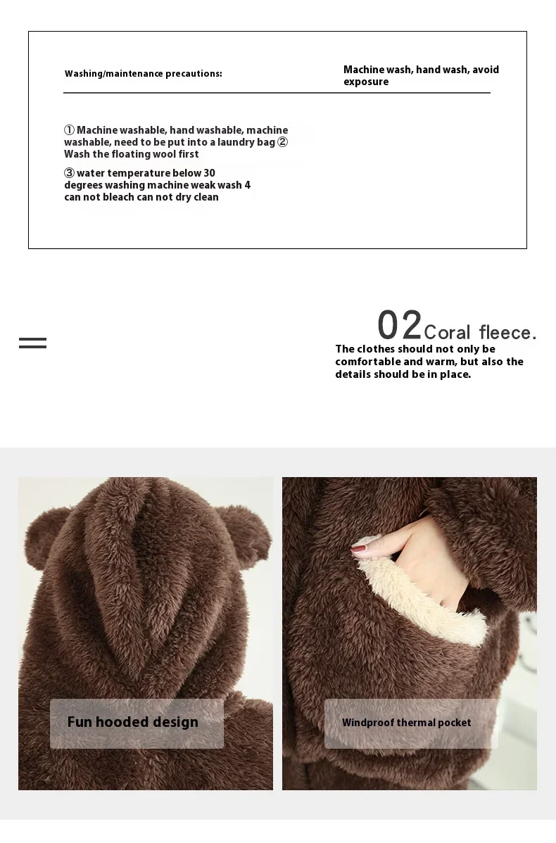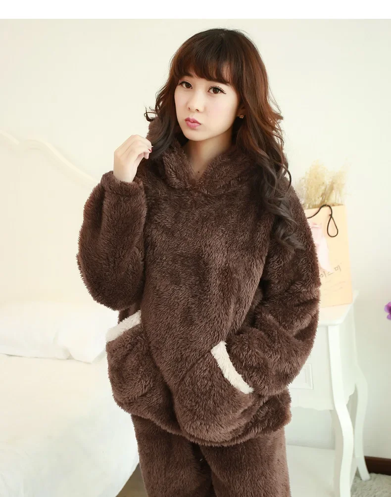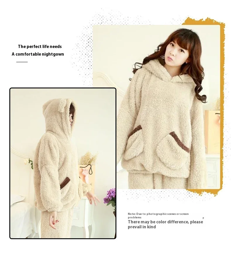 Thickened Warm Autumn Winter Women Cartoon Plush Hooded Bear Sleepwear Ladies Flannel Homewear Set Solid Nightwear Loungewear