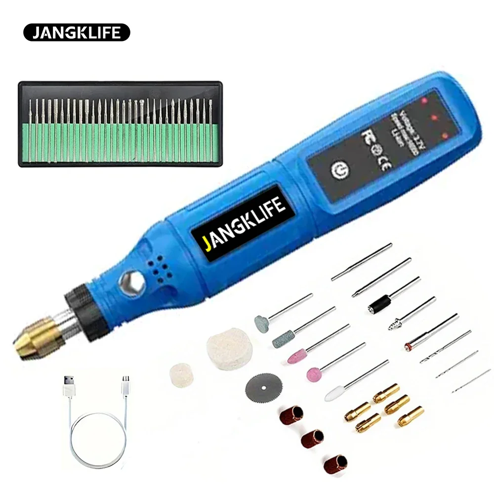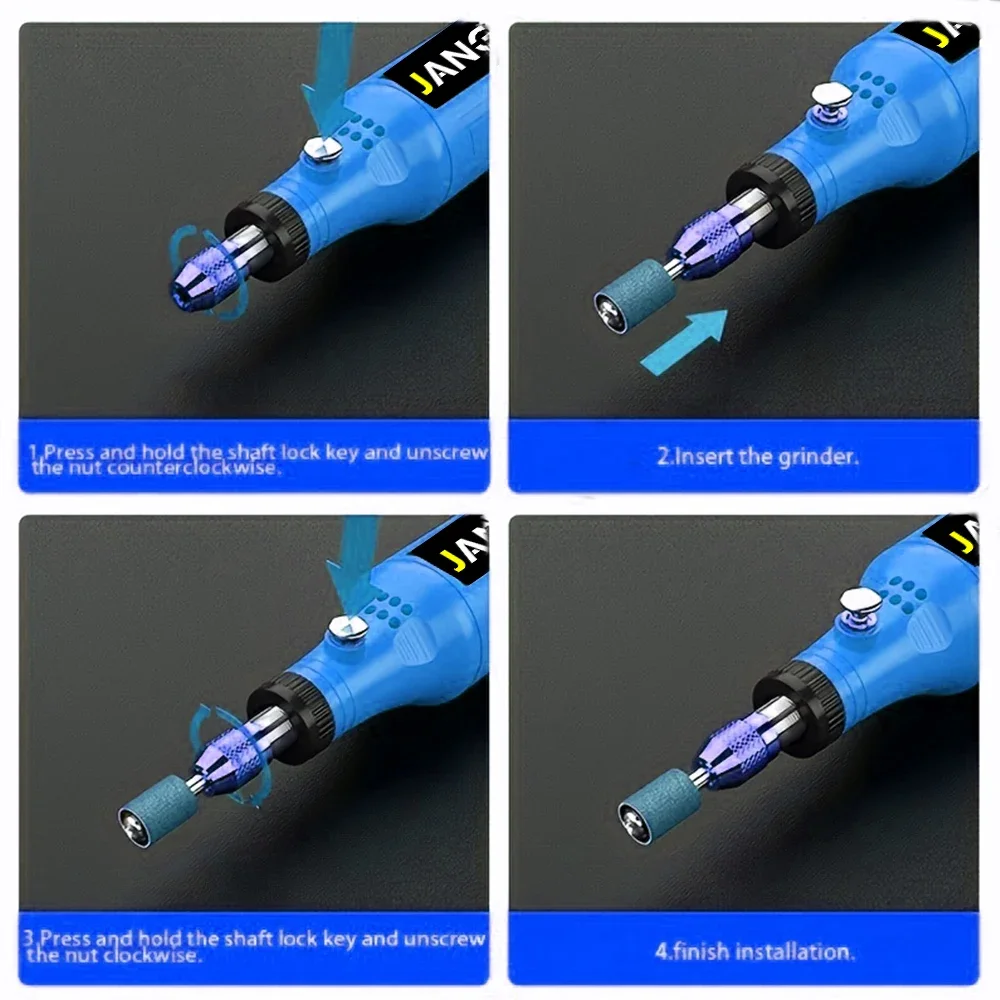This power tool come with 5 collet sizes(1mm,1.6mm,2.35mm,3.0mm.3.2mm), to fits different suitable accessories and it is easily changed.