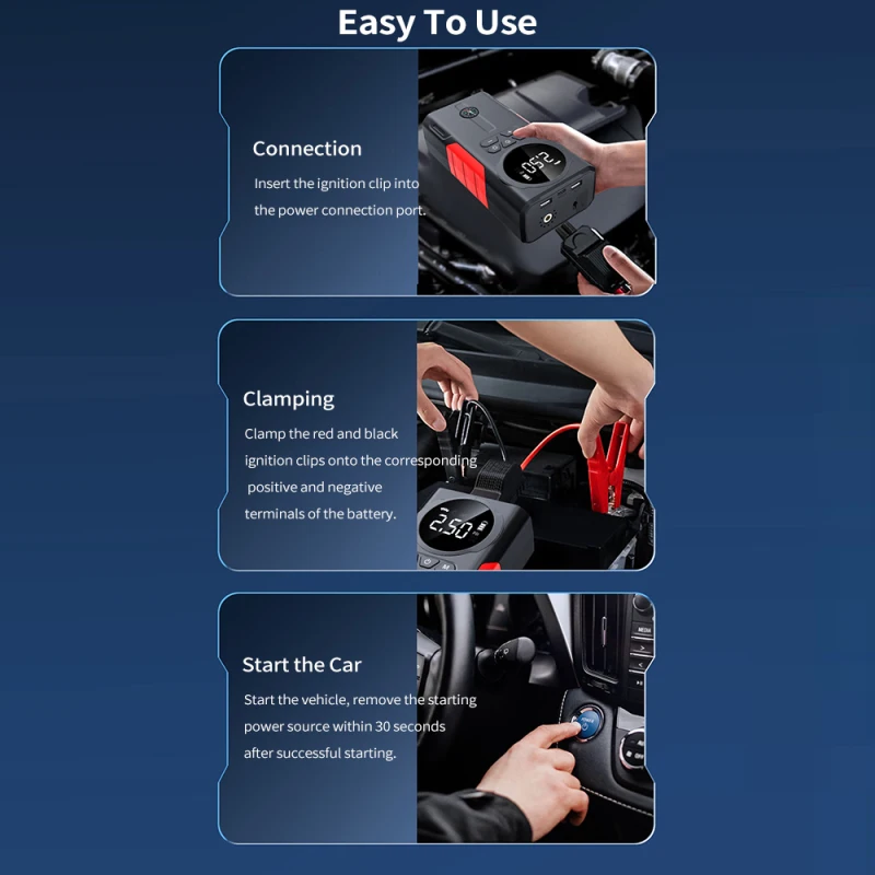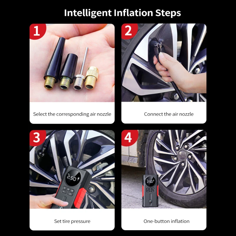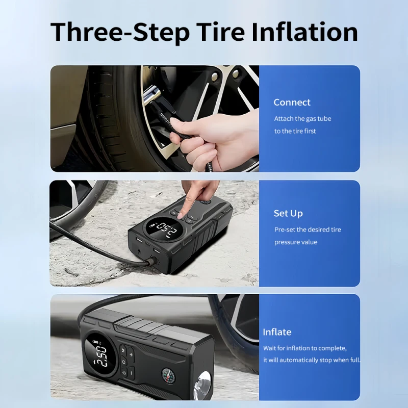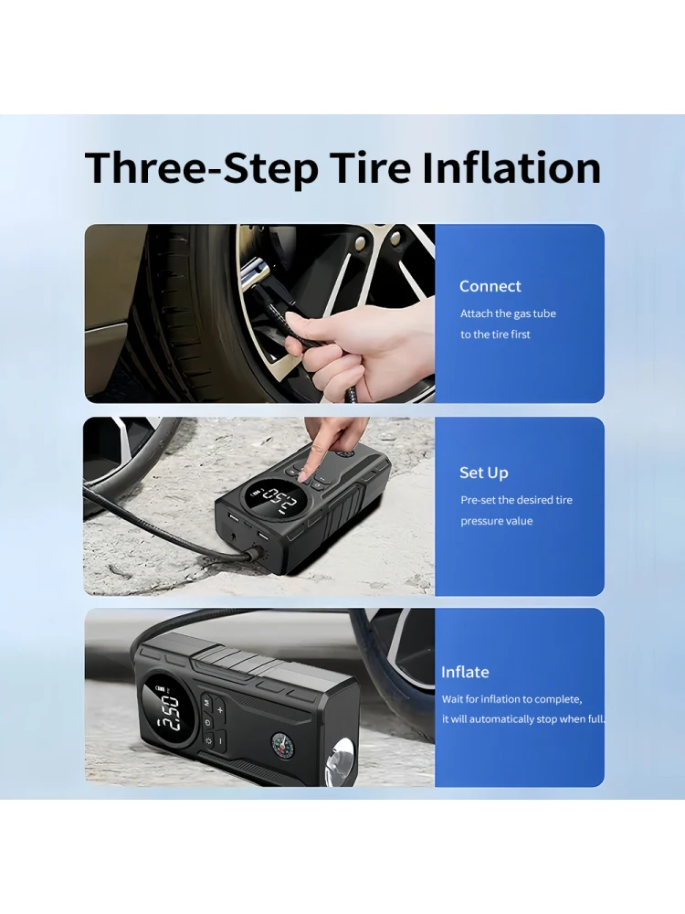 Intelligent Inflation: Our device is not just a jump starter, but also an air compressor. It offers rapid inflation with a preset tire pressure function, automatically stopping when the desired pressure is reached. Plus, it operates with intelligent noise reduction, providing a quiet and efficient operation.