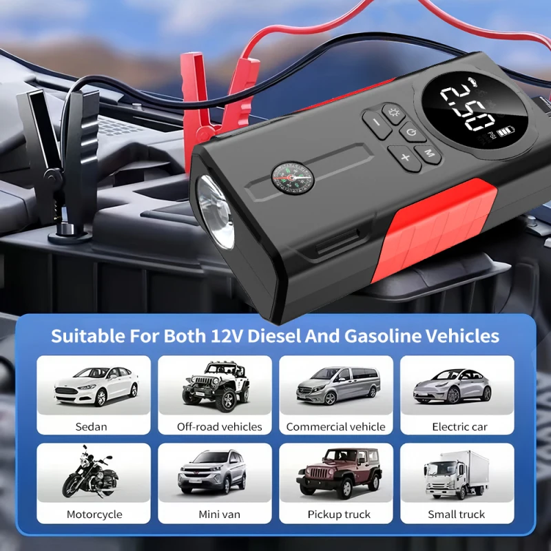 Wide Compatibility: This cordless jump starter is designed to instantly start both 12V diesel and gasoline vehicles. Whether you have a sedan, SUV, commercial vehicle, electric car, motorcycle, minivan, pickup truck, or small truck, our jump starter can jump-start it.