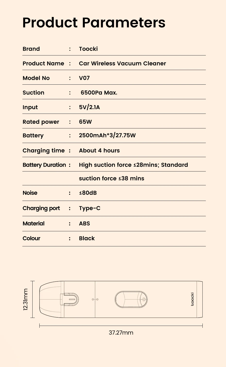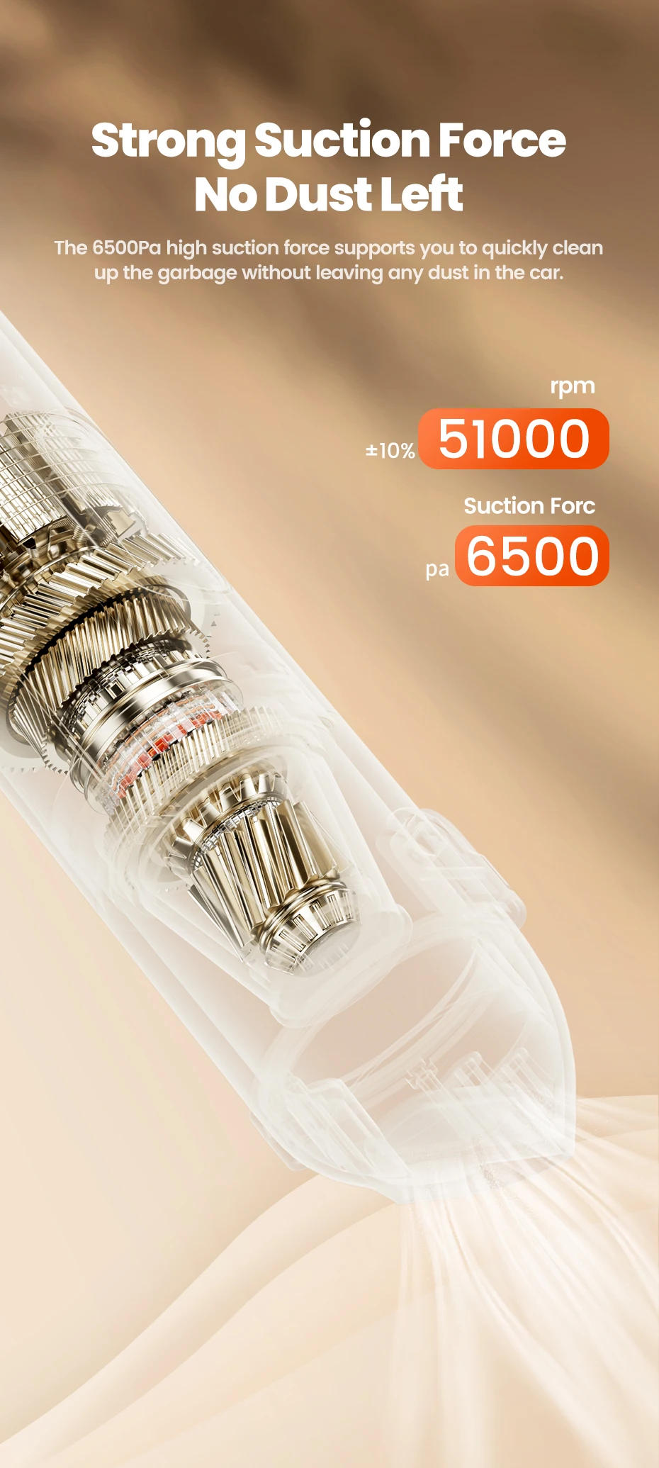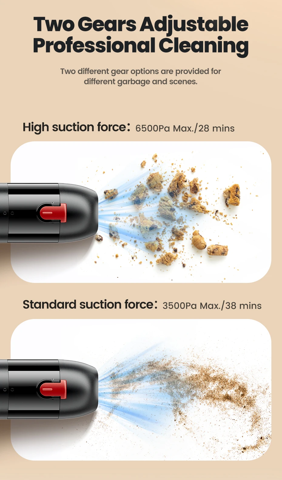 • High Suction Power :With a suction power of 6500Pa, it can easily clean carpets and upholstery.