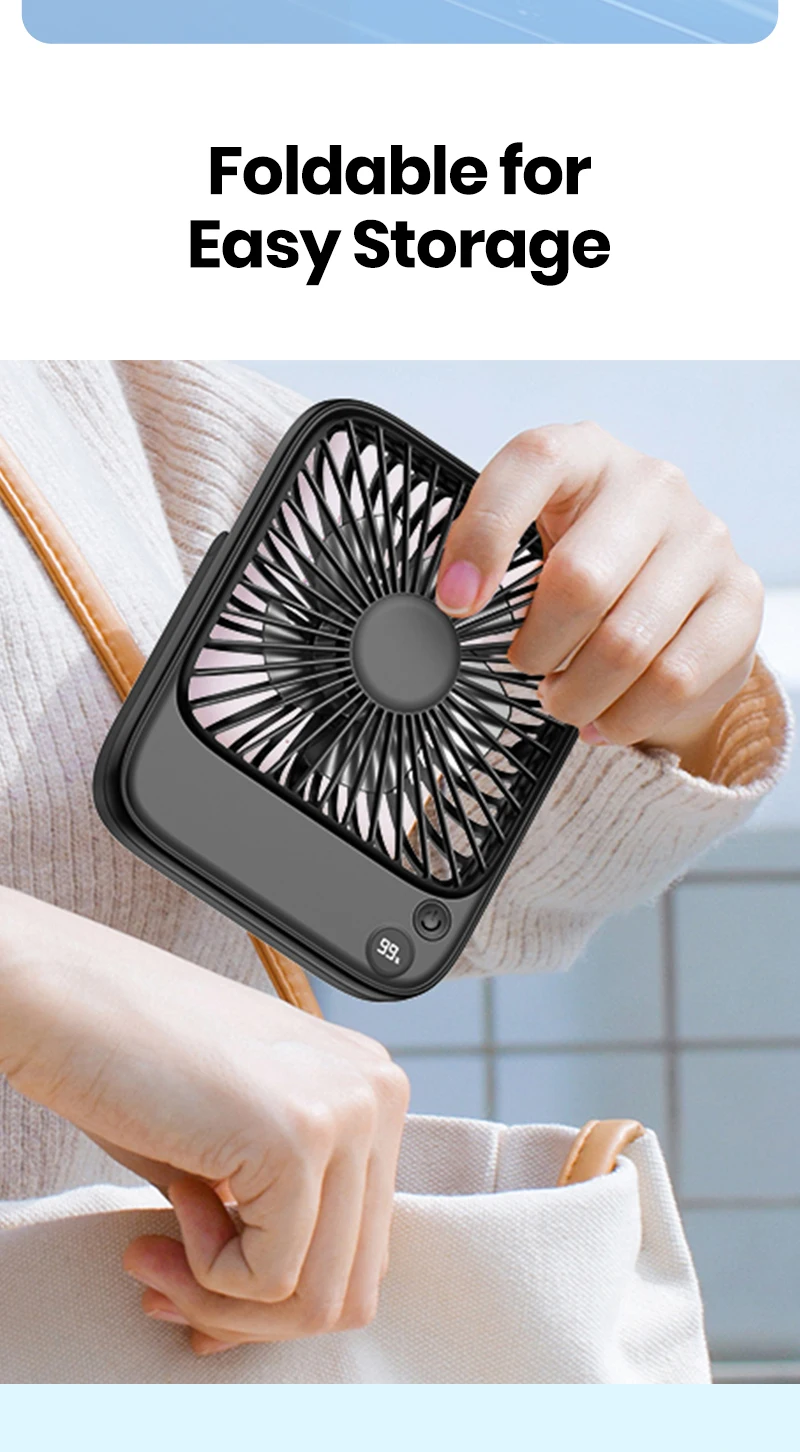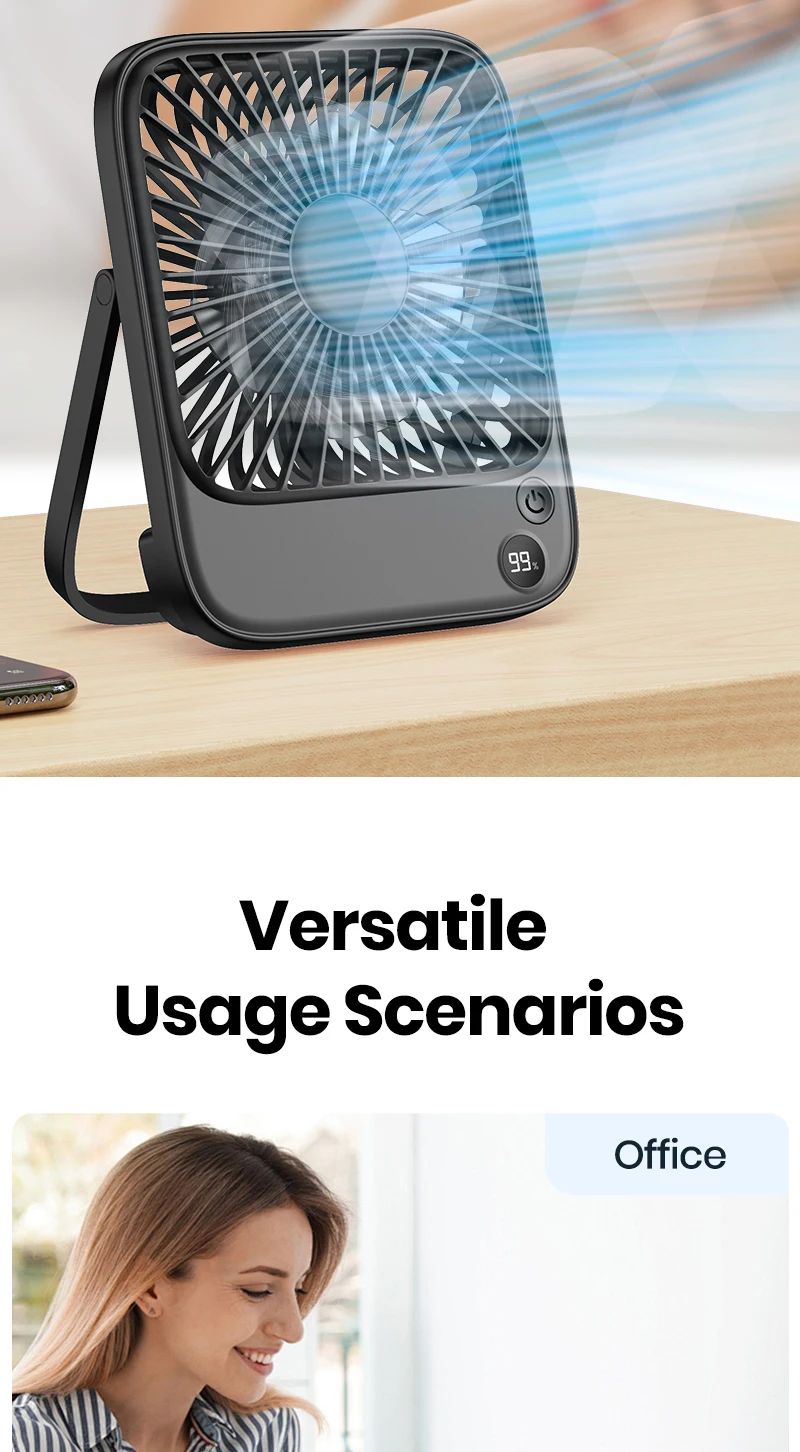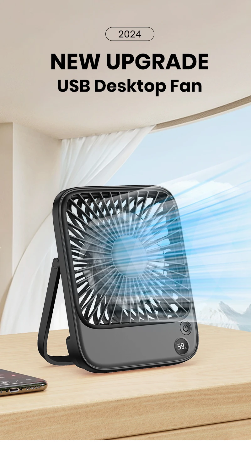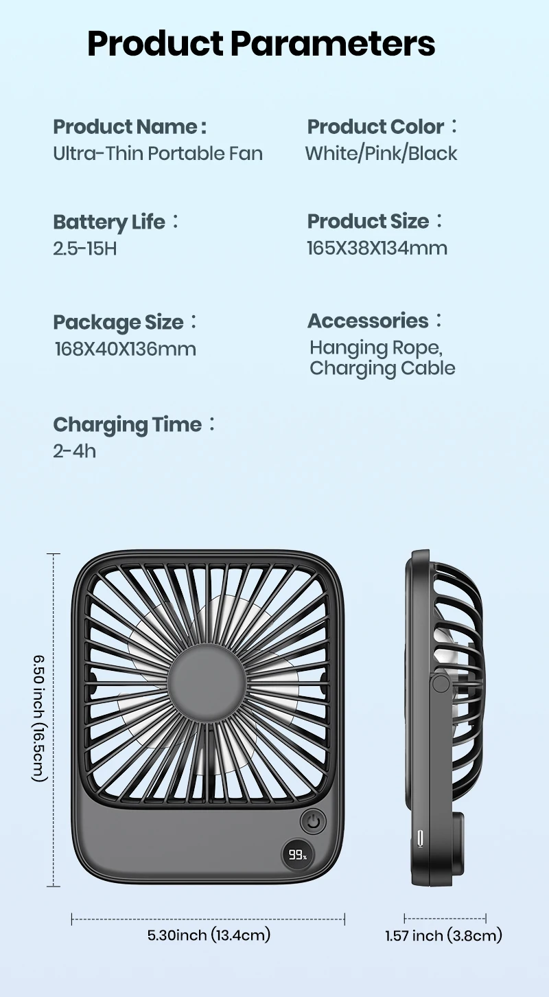 Ultra-Thin Design for Optimal Space Saving — Measuring at a compact 6.5×5.3×1.57inch, this slim desktop fan effortlessly blends into any setting, adding a touch of elegance while preserving precious desk space.