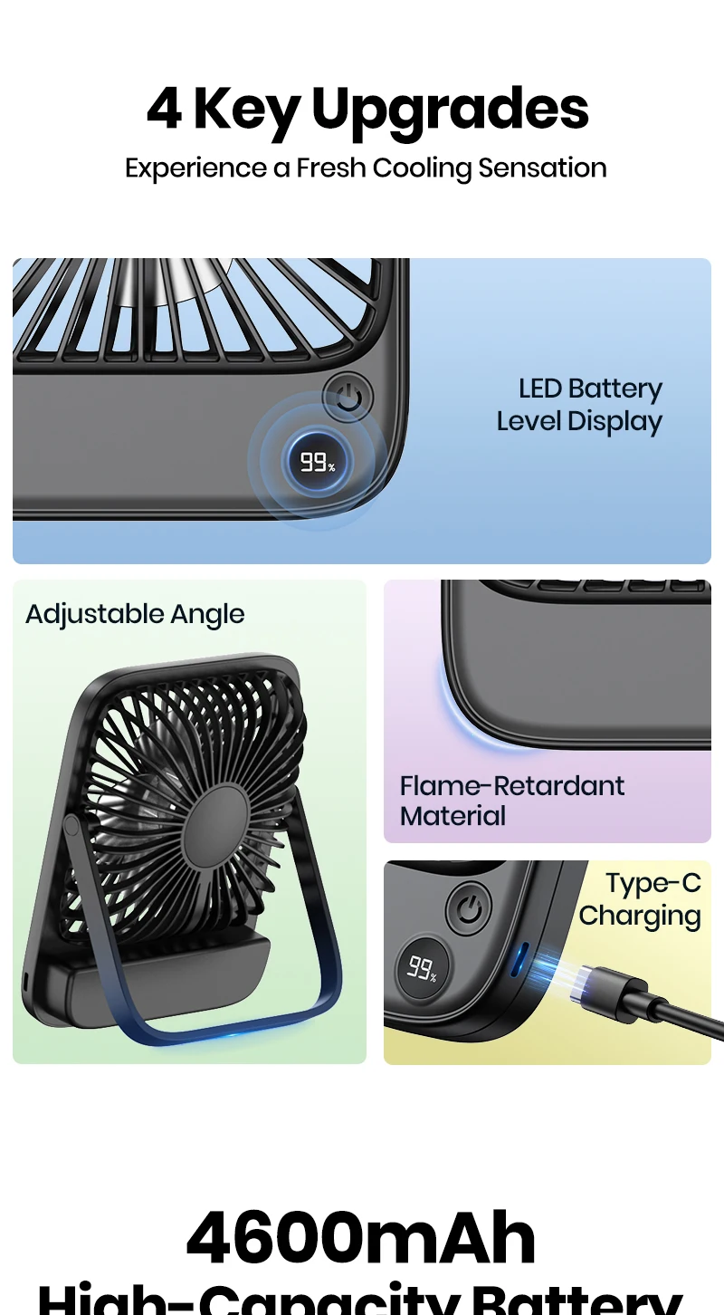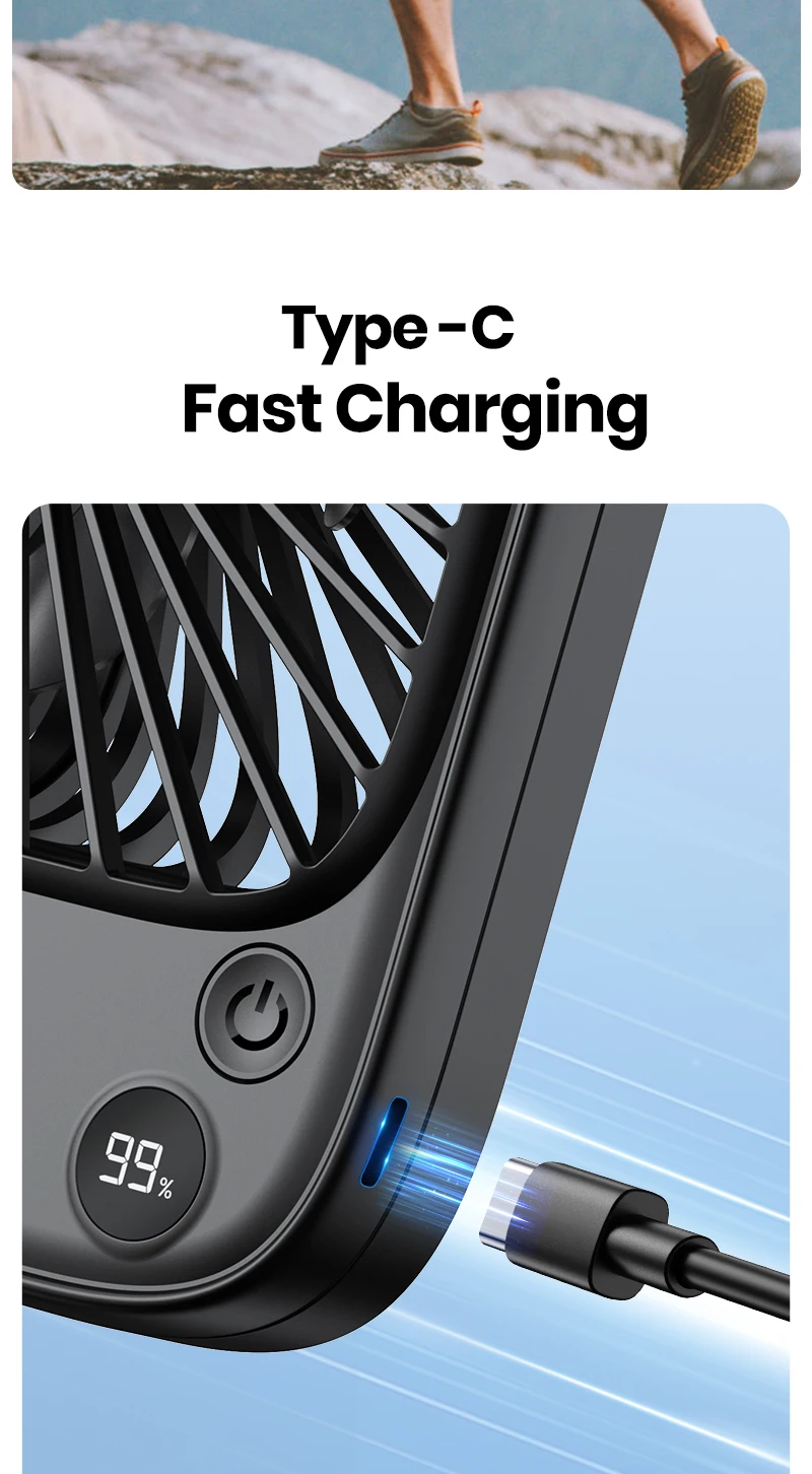 Convenient USB-C Charging & Intuitive Display — Equipped with a USB-C charging port for universal compatibility and faster charging, this fan also features a built-in screen that clearly indicates battery remaining power and current speed setting, allowing for effortless control and peace of mind.