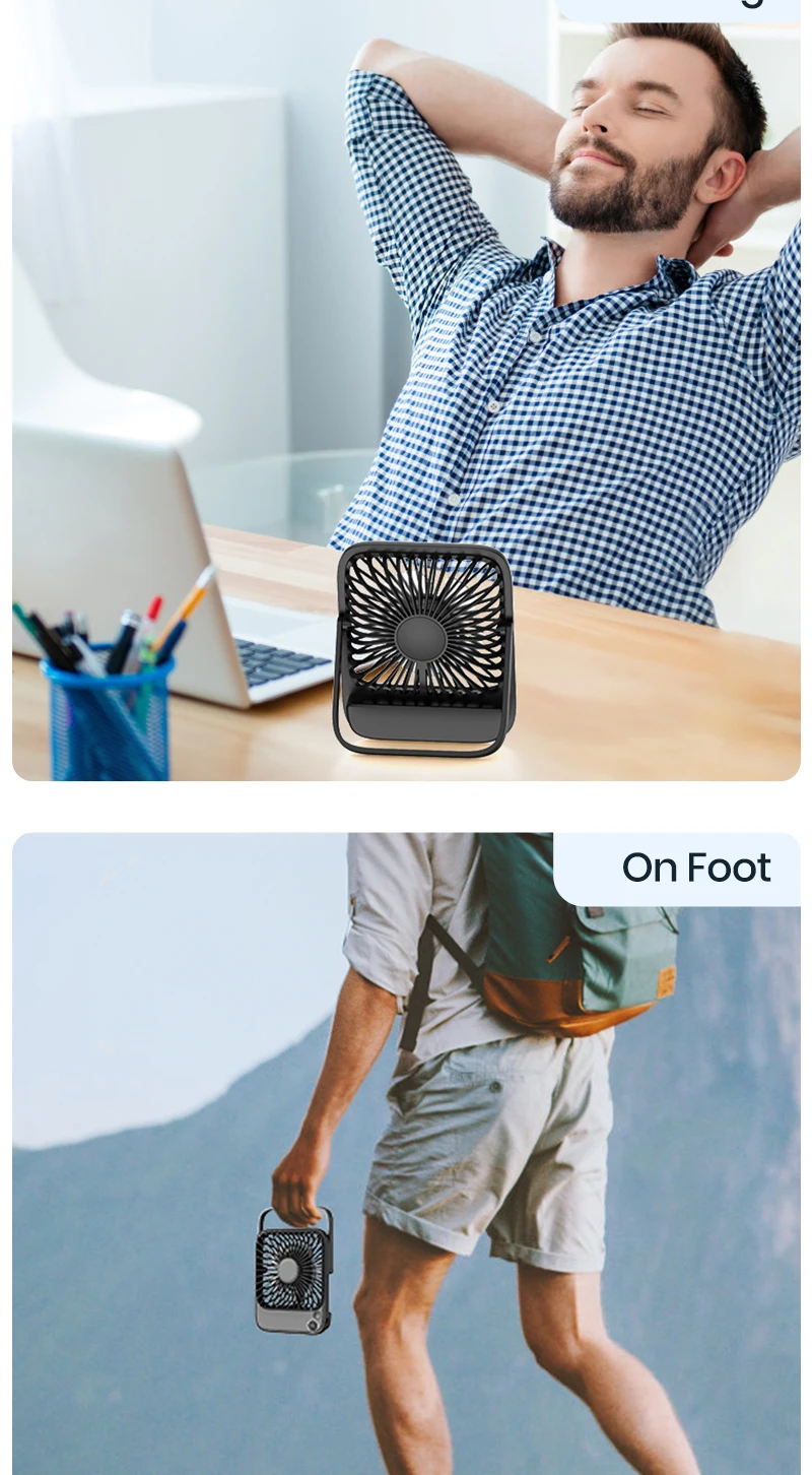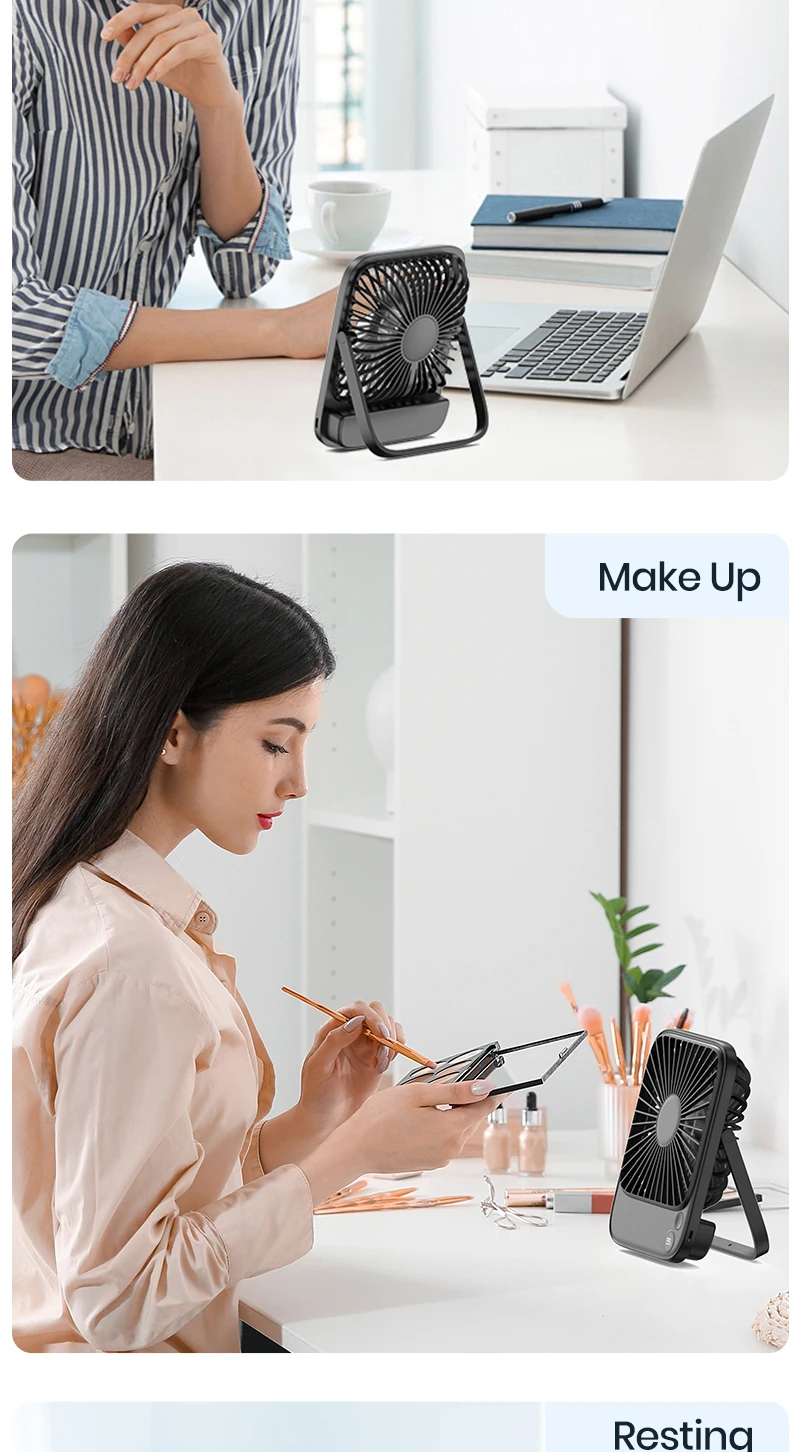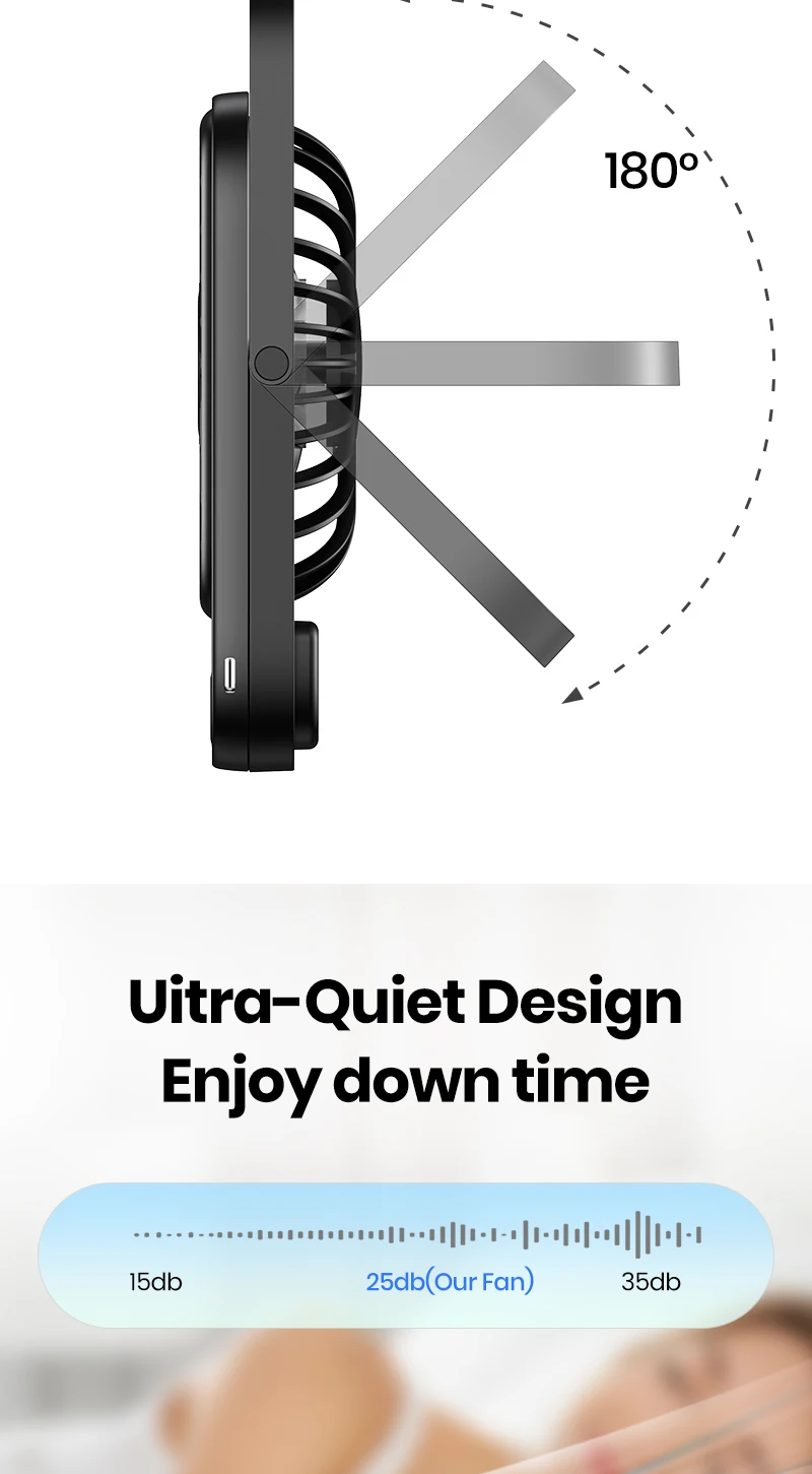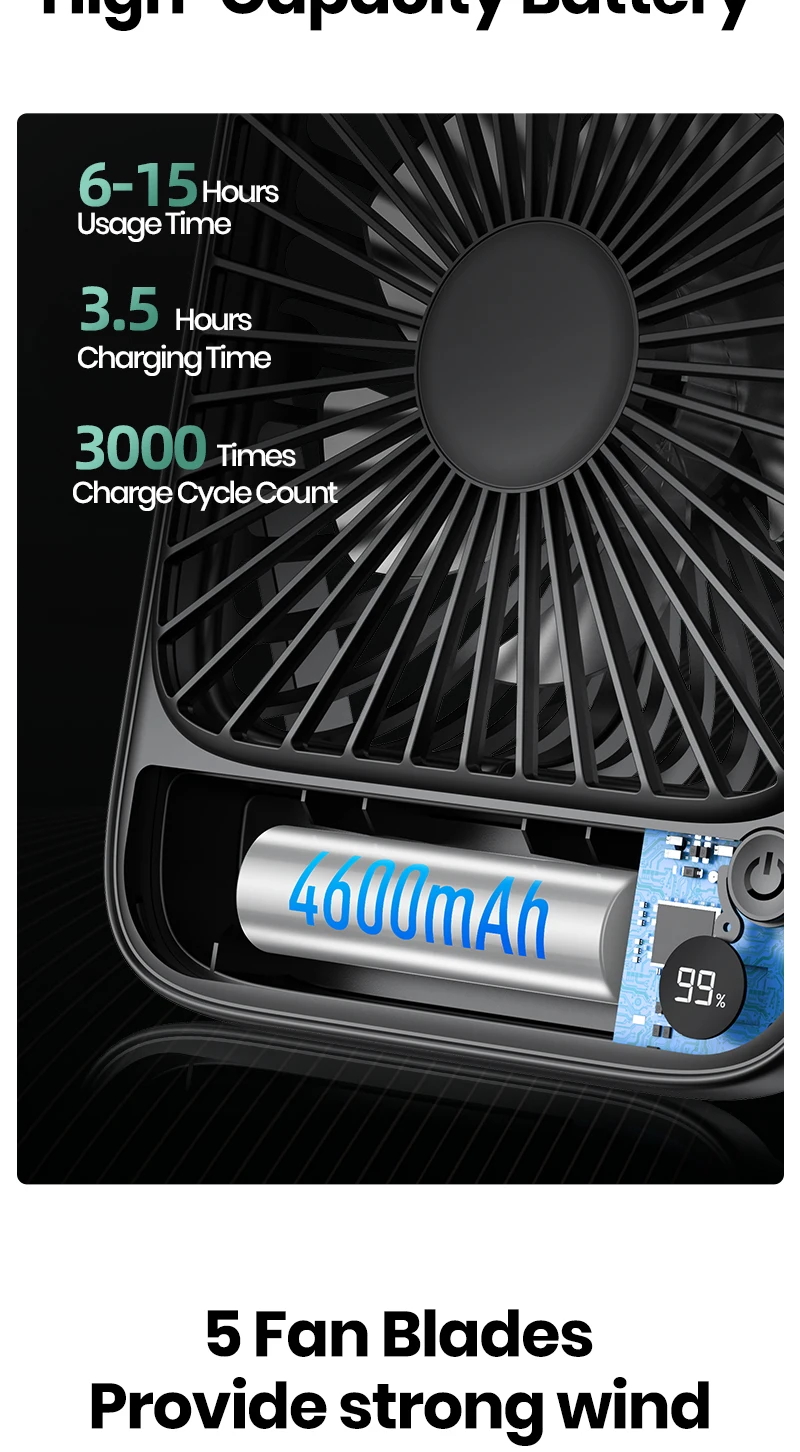 5000mAh Battery — Stay cool all day long with up to 14 hours of continuous operation from a single full charge. The integrated 5000mAh rechargeable battery keeps you refreshed, whether you’re indoors or out on travel.