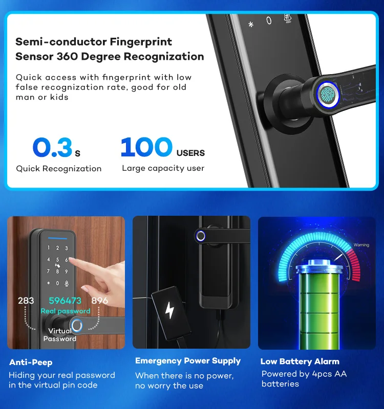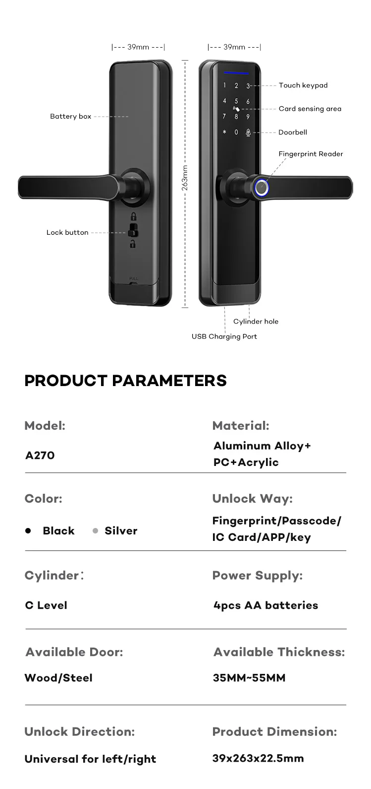Unlocking Methods: These locks offer multiple unlocking methods, including fingerprint scanning, a touch keypad with backlit design, physical buttons, and support for MIFARE cards.