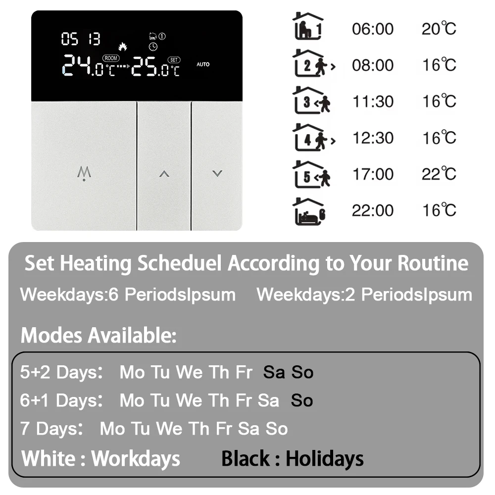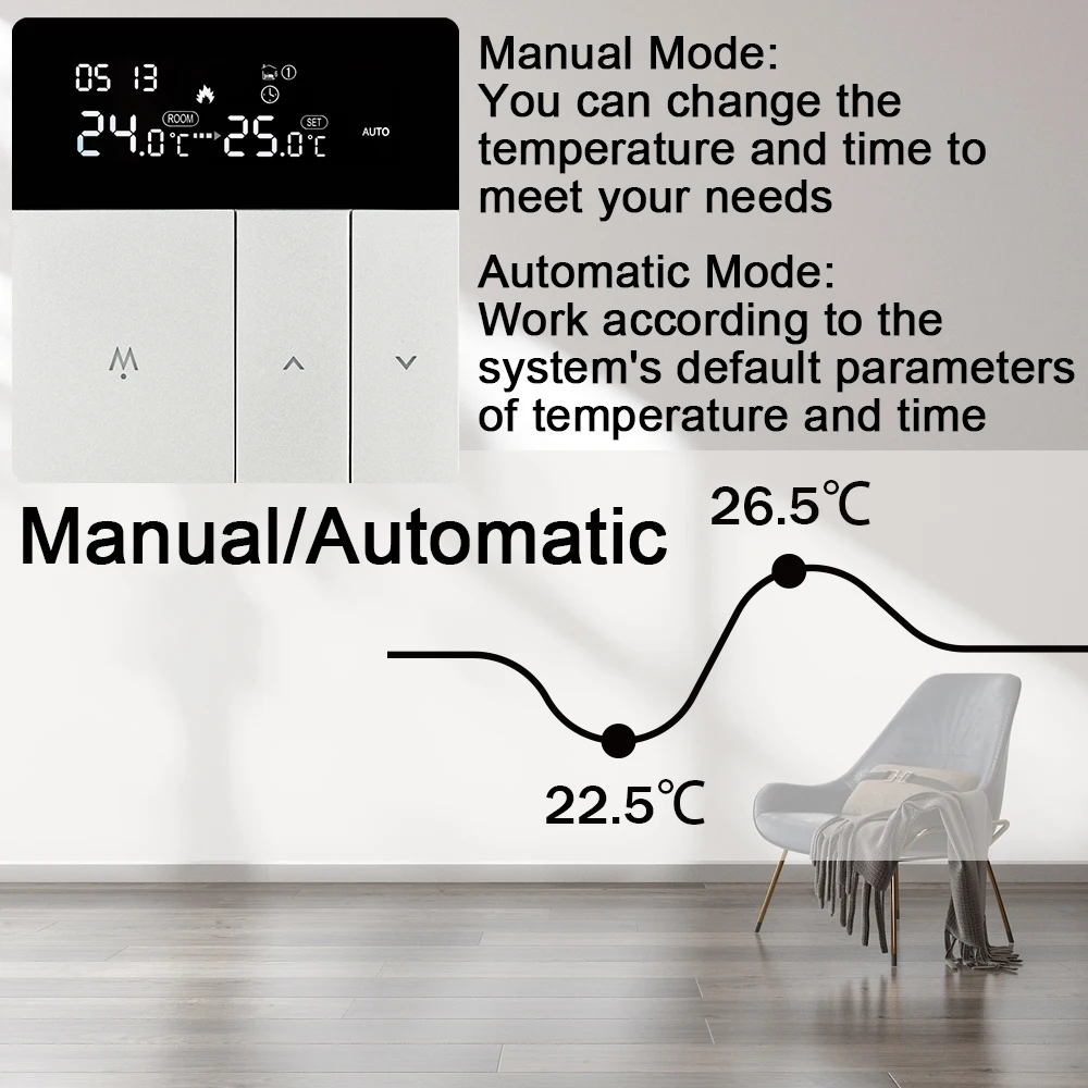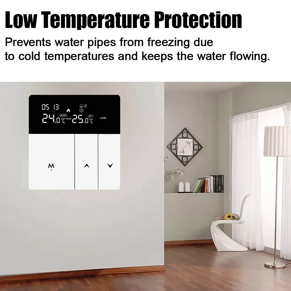 Smart water heating thermostat is suitable for indoor temperature control of household floor water heating systems or heating systems such as boilers. Can be widely used in Asia, Europe, and the United States. Perfectly blend your decoration style and support customization.