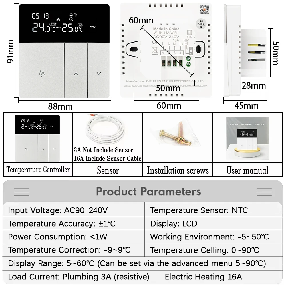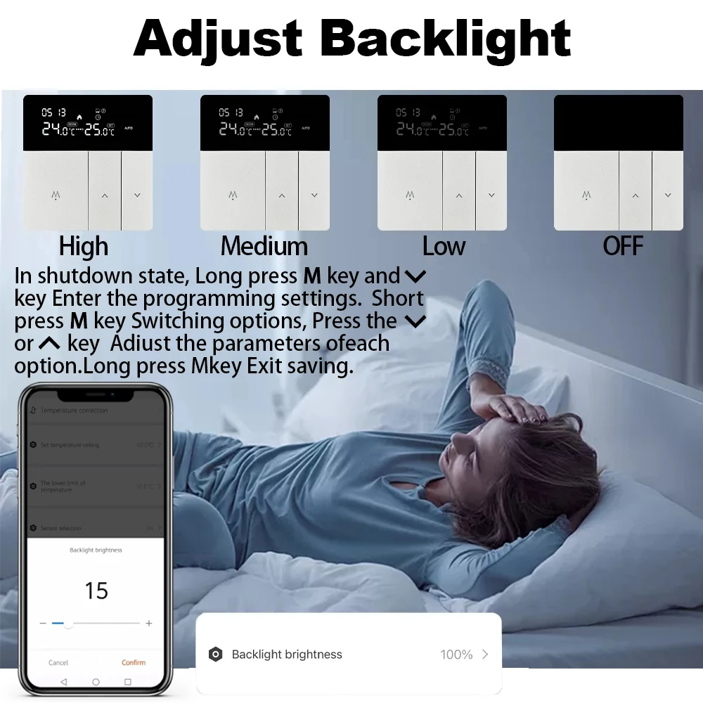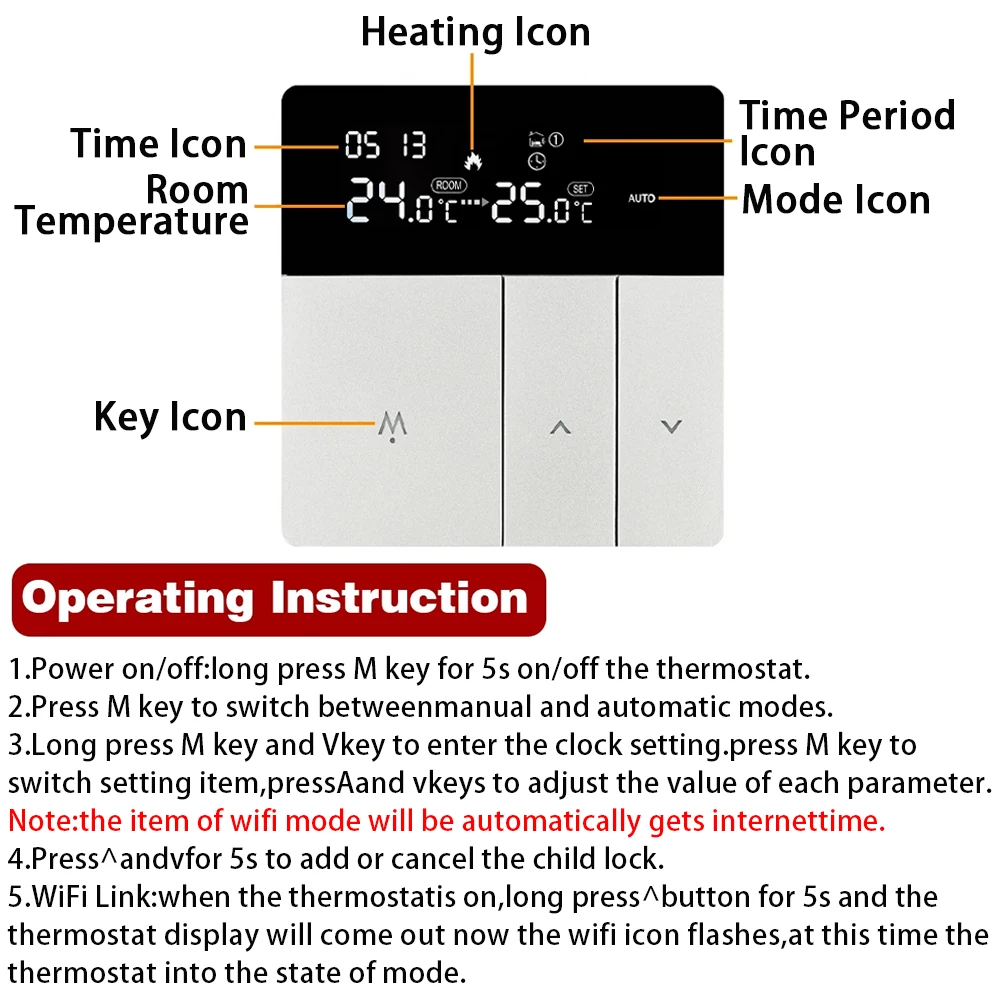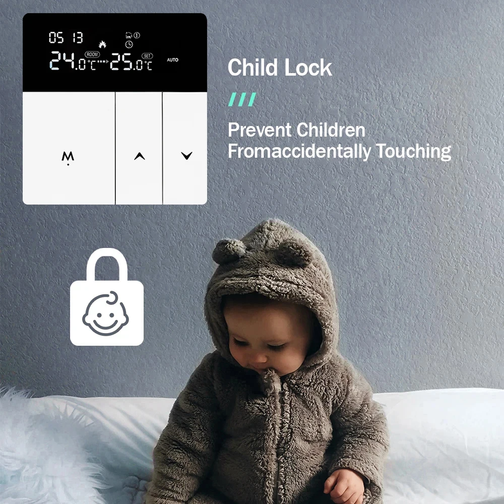 Smart water heating thermostat is suitable for indoor temperature control of household floor water heating systems or heating systems such as boilers. Can be widely used in Asia, Europe, and the United States. Perfectly blend your decoration style and support customization.