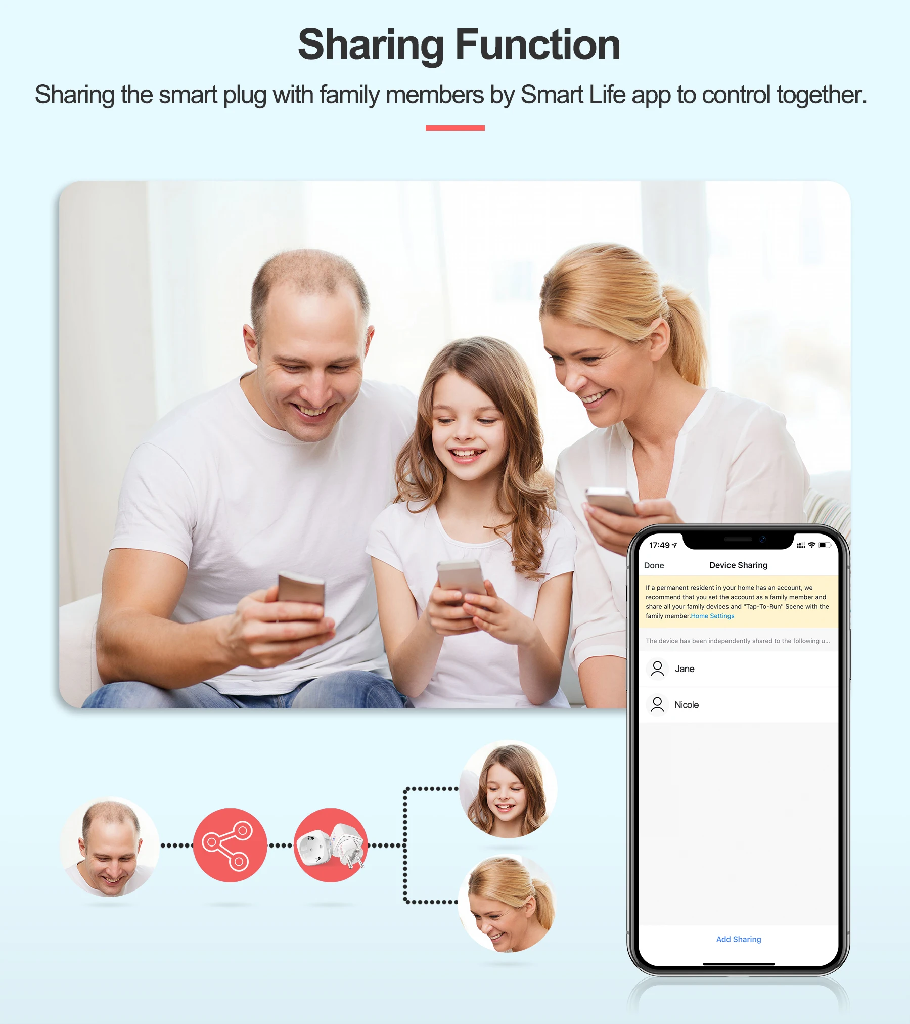 One-tap to share the smart plug with your family member by app to eliminate extra setup processes.