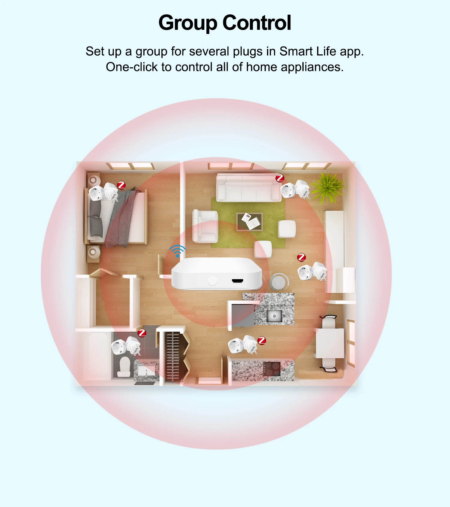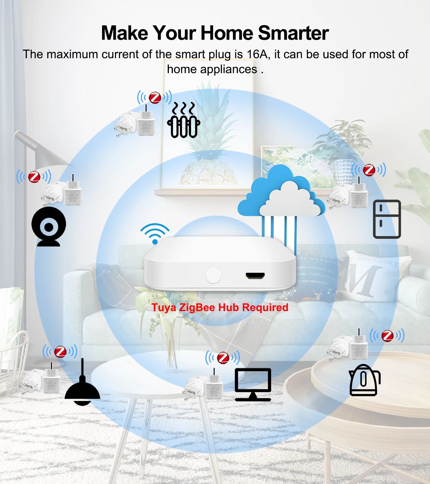A Tuya ZigBee hub is a must to the ZigBee smart plug for app remote control and voice control. Also, you can link other Tuya ZigBee products with the hub to realize a complete smart home system for your house.
