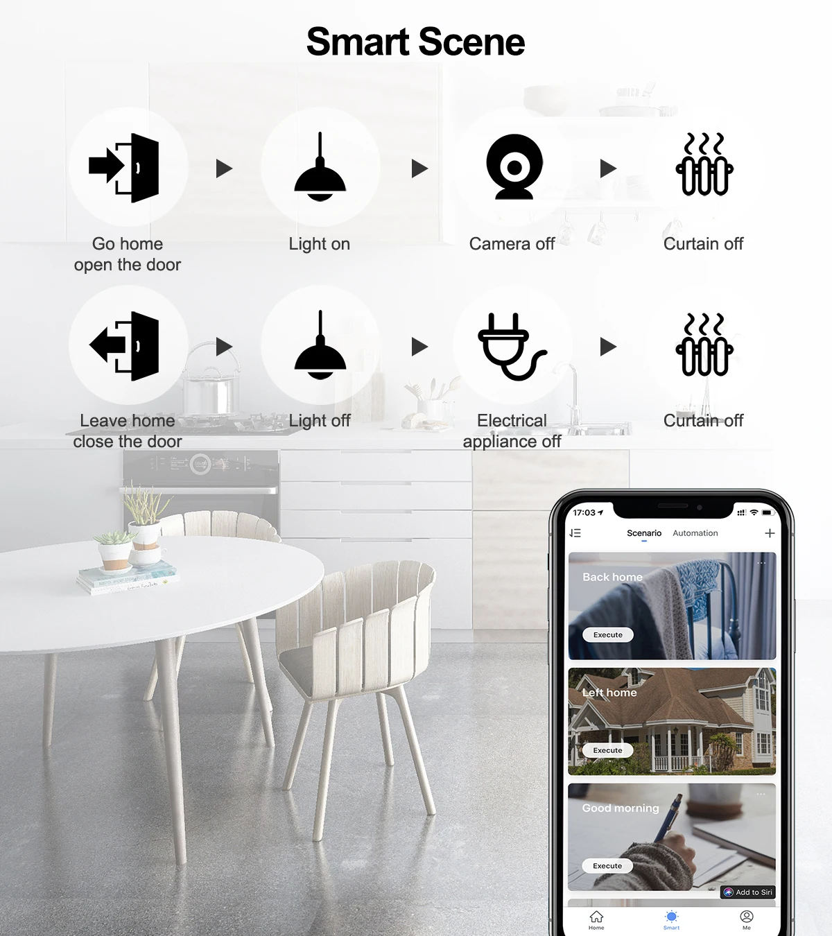 Creating your own scene to trigger ON/OFF home appliances by departure mode, home mode, temperature, humidity, or other conditions.