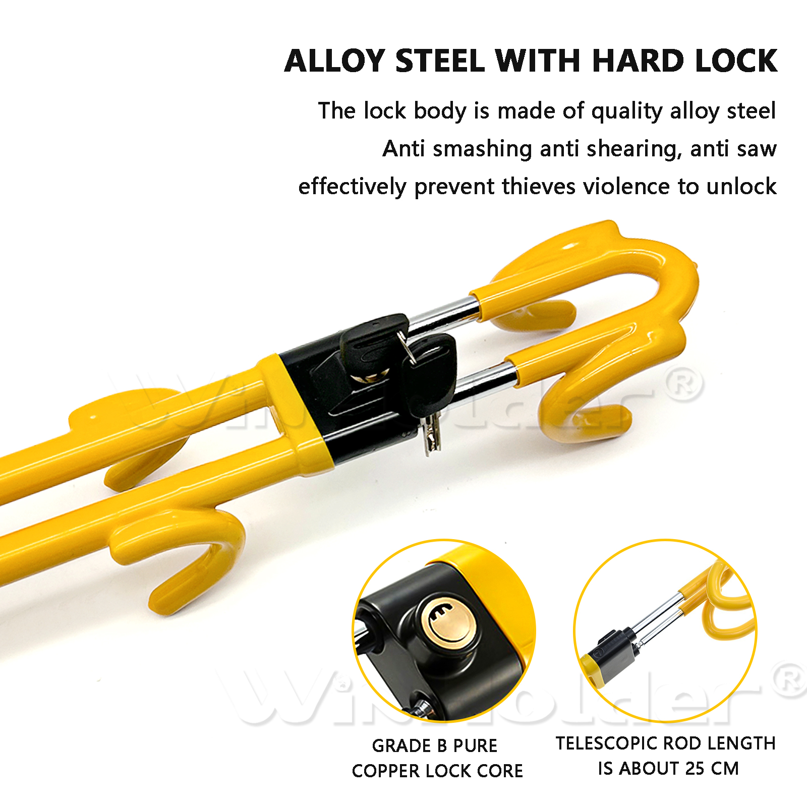 SECURE – Heavy-duty metal crook locks for cars; locks steering wheel in position.