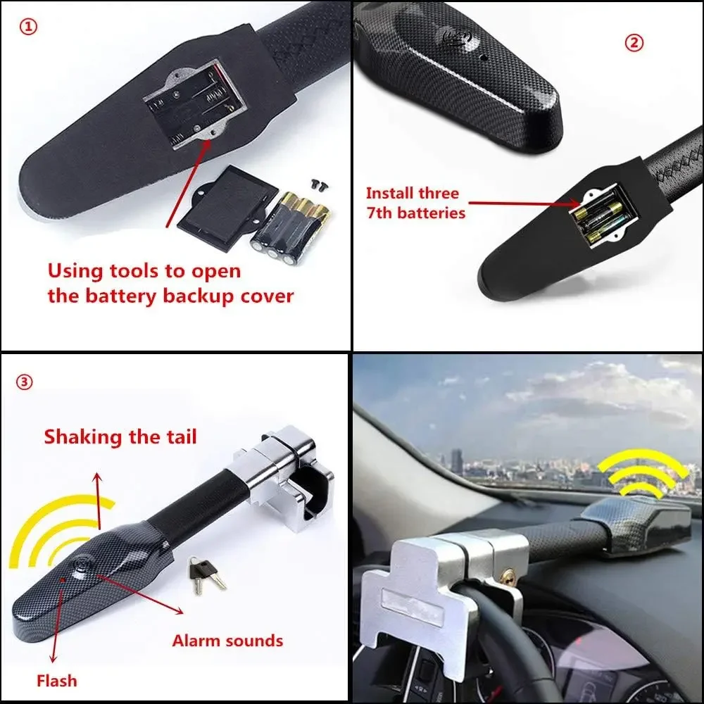 ENHANCED SECURITY: This steering wheel lock with alarm features a micro-movement device that activates a loud 130-decibel alarm within 8 seconds of vibration, deterring thieves before they can strike