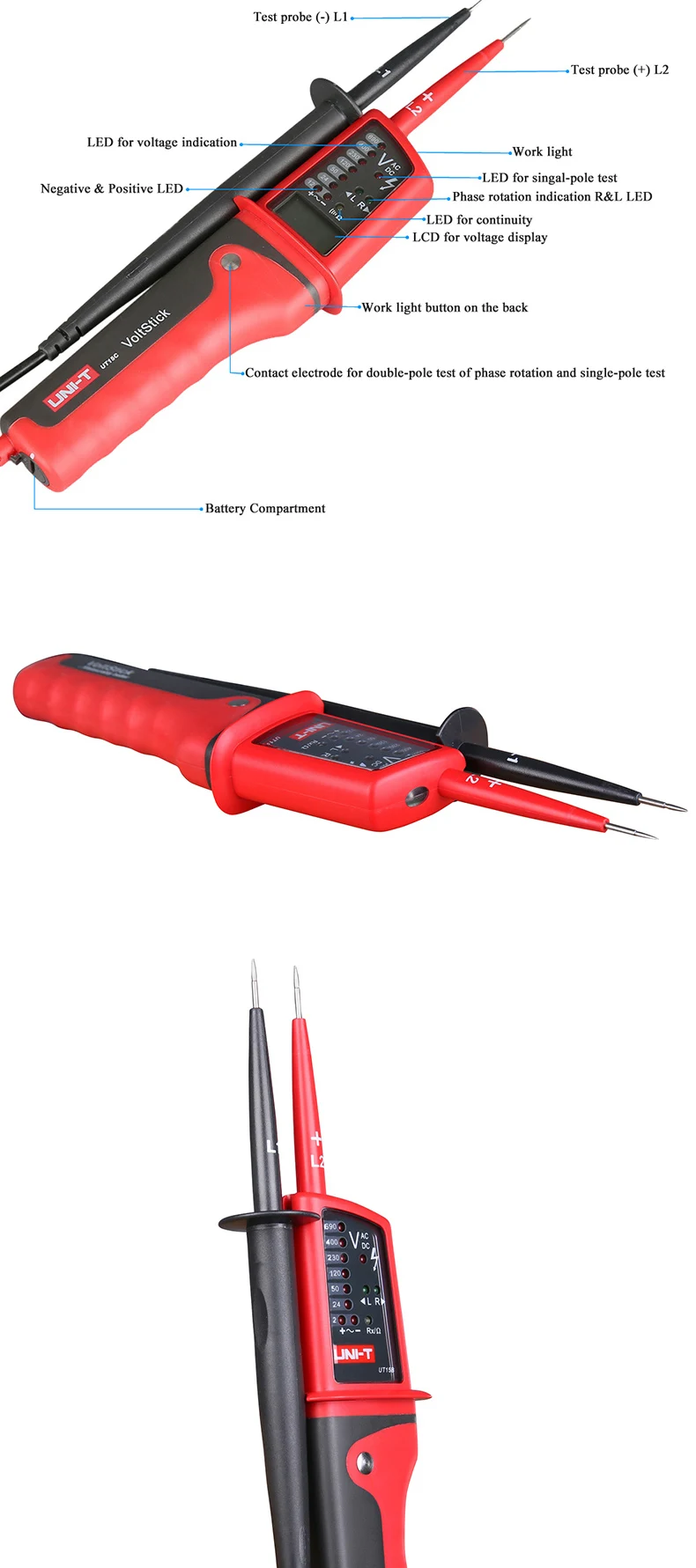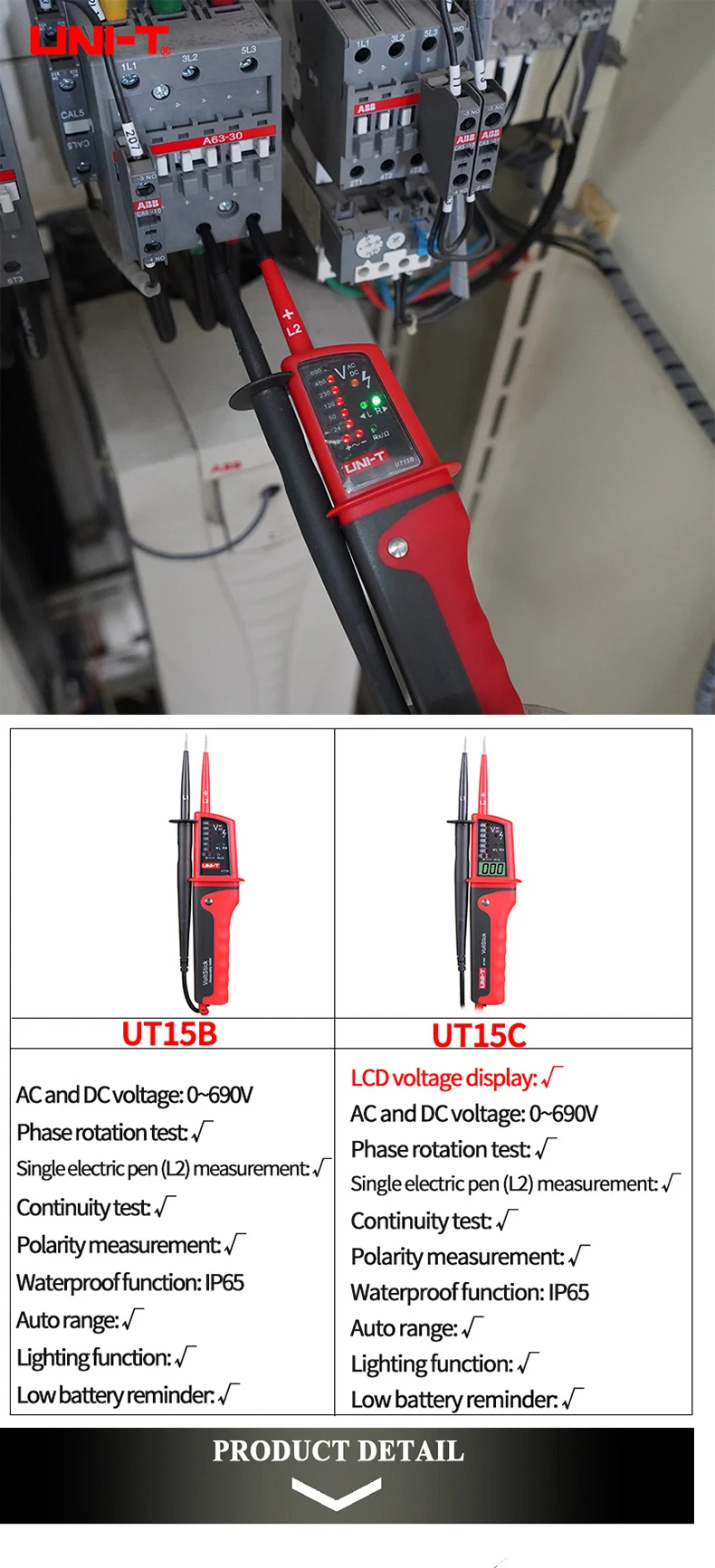 UT18 series are designed for testing AC/DC voltage, 3-phase voltage, phase sequence, continuity, and more. This series is categorized as CAT IV 600V and meets IP65 standard. These voltage testers are perfect tools for electricians to quickly measure voltage levels in all environments. This series should NOT be used with 110V electrical systems.