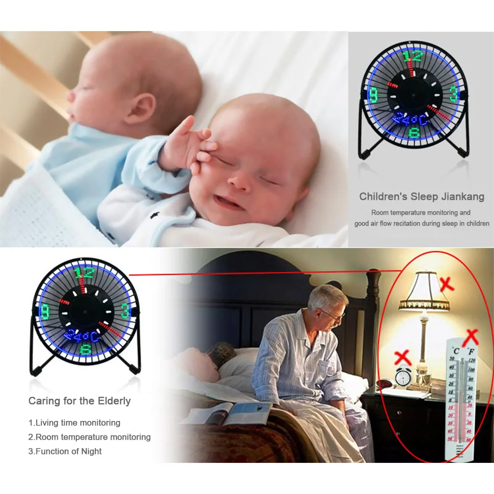 Features: When the fan rotates, the clock and ambient temperature are displayed in real time