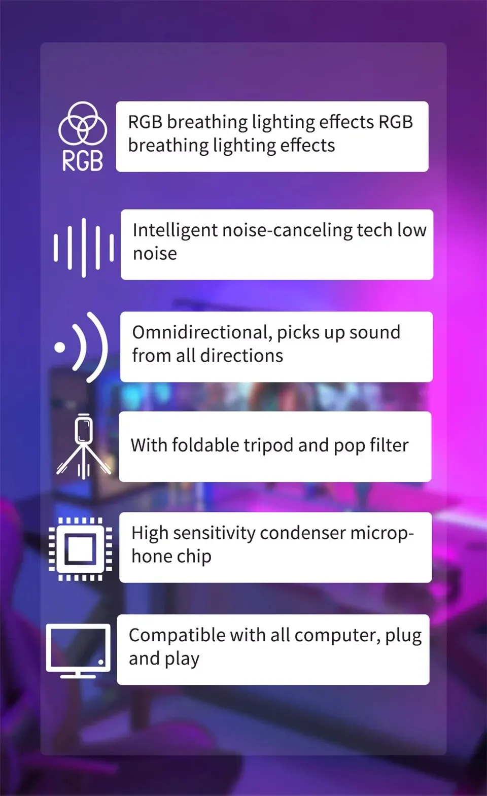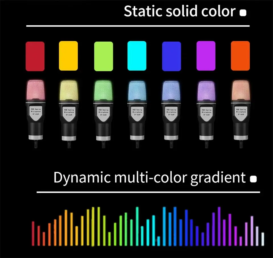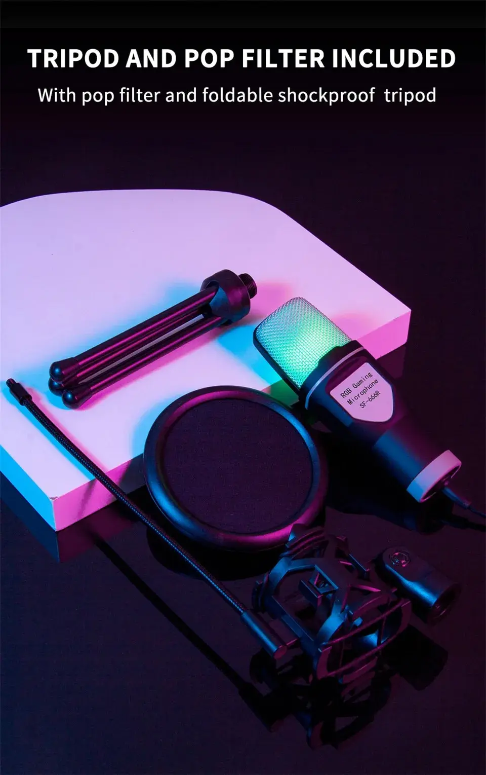• RGB Lighting :The microphone comes with RGB lighting, adding a touch of style to your gaming or streaming setup.