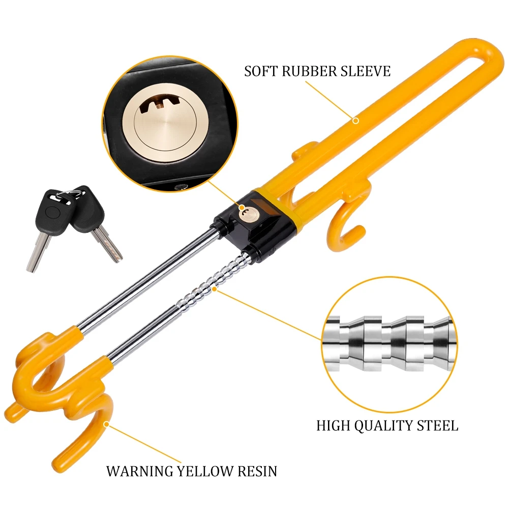 1.Widely used: the four hooks U-shaped design steering wheel lock can position the steering wheel and lock the steering wheel of various types easily, with one pull, it fits for any cars which inner diameter of steering wheel is 7-12.8 inches, like Car Truck SUV Pickup RV Golf Cart Caravans Motorhomes etc.
