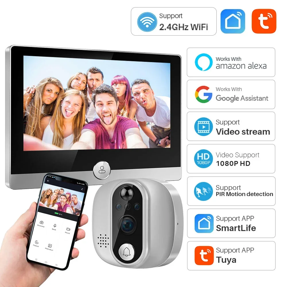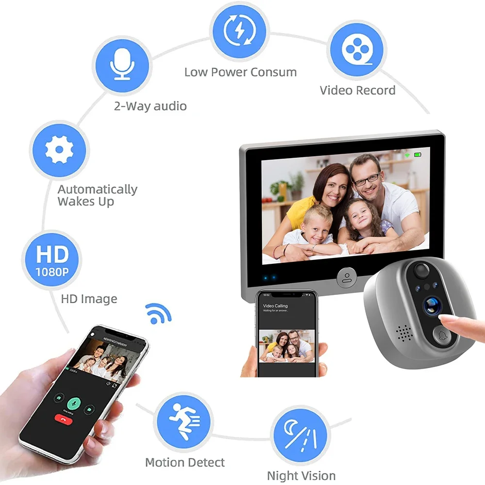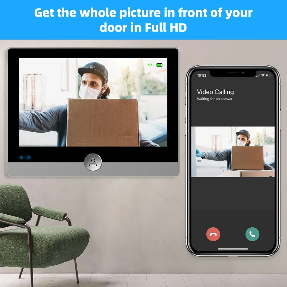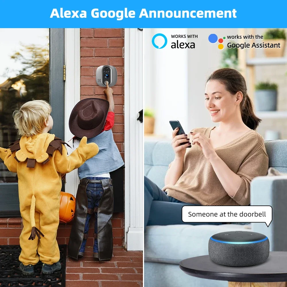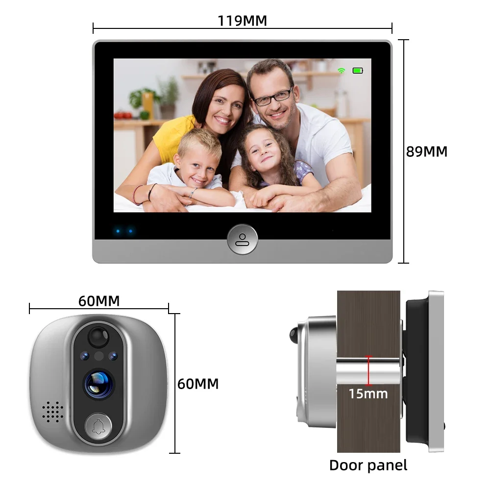 Our device is installed in the peephole position on the door to replace the optical door viewer, integrating the peephole door viewer, visual doorbell, and security camera in one. It solves the problem that the elderly and children can’t see outside the door and prevents safety accidents. It has built-in PIR function, which can automatically take photos or videos outside the door. It also has wifi function for remote visual intercom and remote monitoring. And it supports Alexa Echo Show and Google Home.