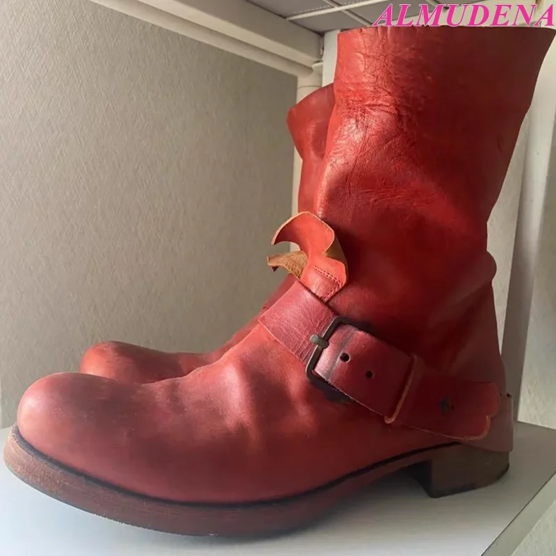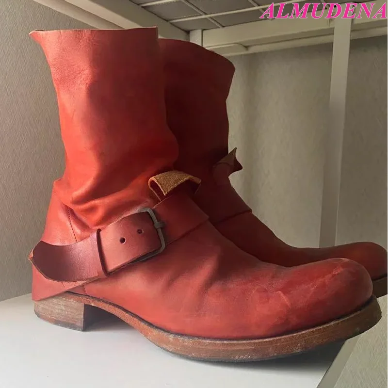 Vintage Wasteland Red Leather Chunky Heel Ankle Boots Women’s Buckled Flat Round Toe Big Size Booties Soft Luxury Designer Shoes