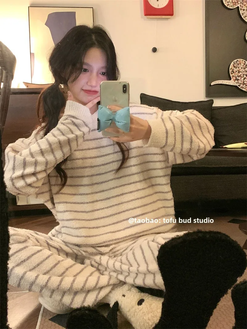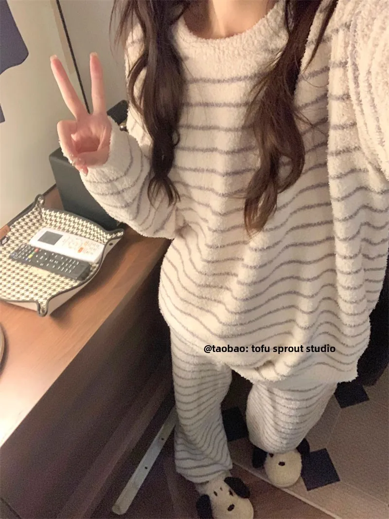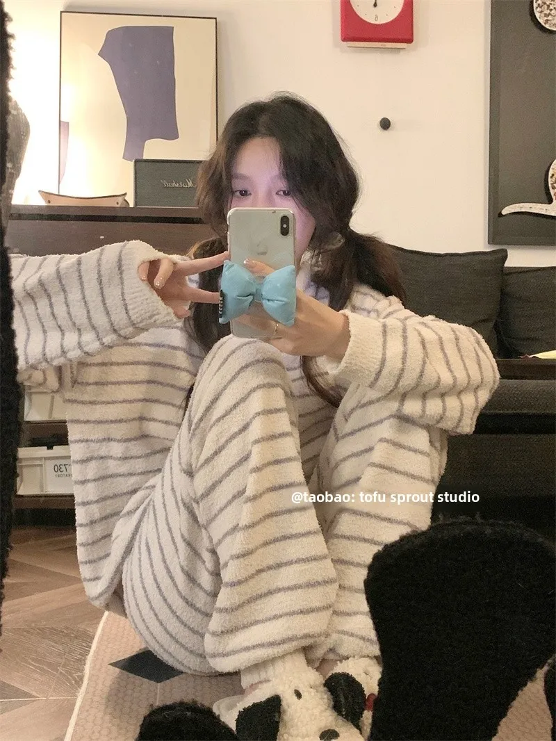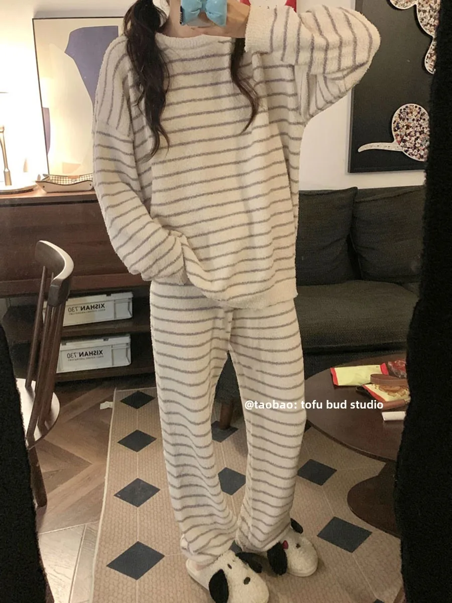 Warm Thickened Coral Fleece Pajamas Women’s Long Sleeve Fluffy Home Clothes Set Sweet Simple Sle Winter Sleepwear