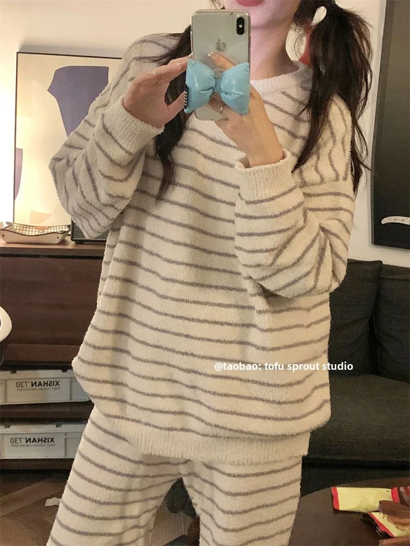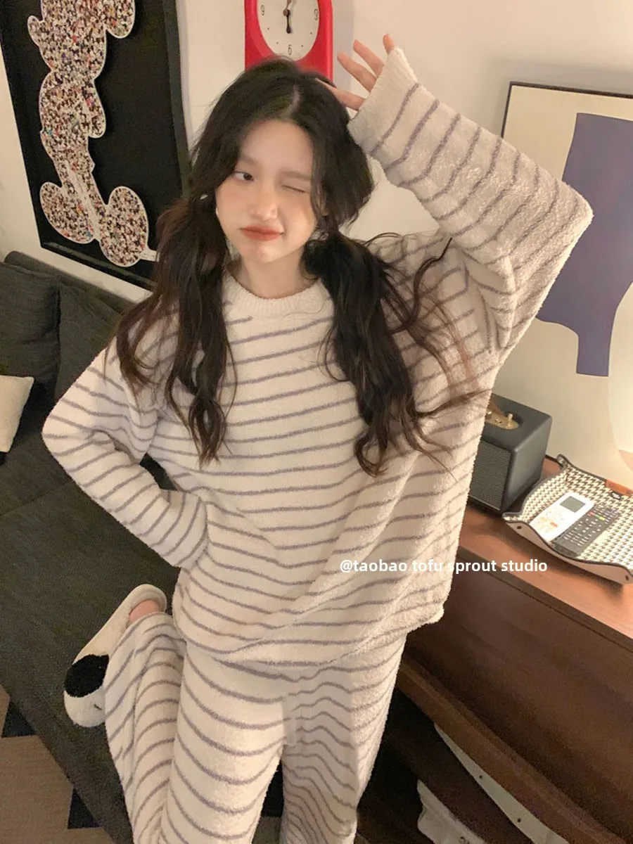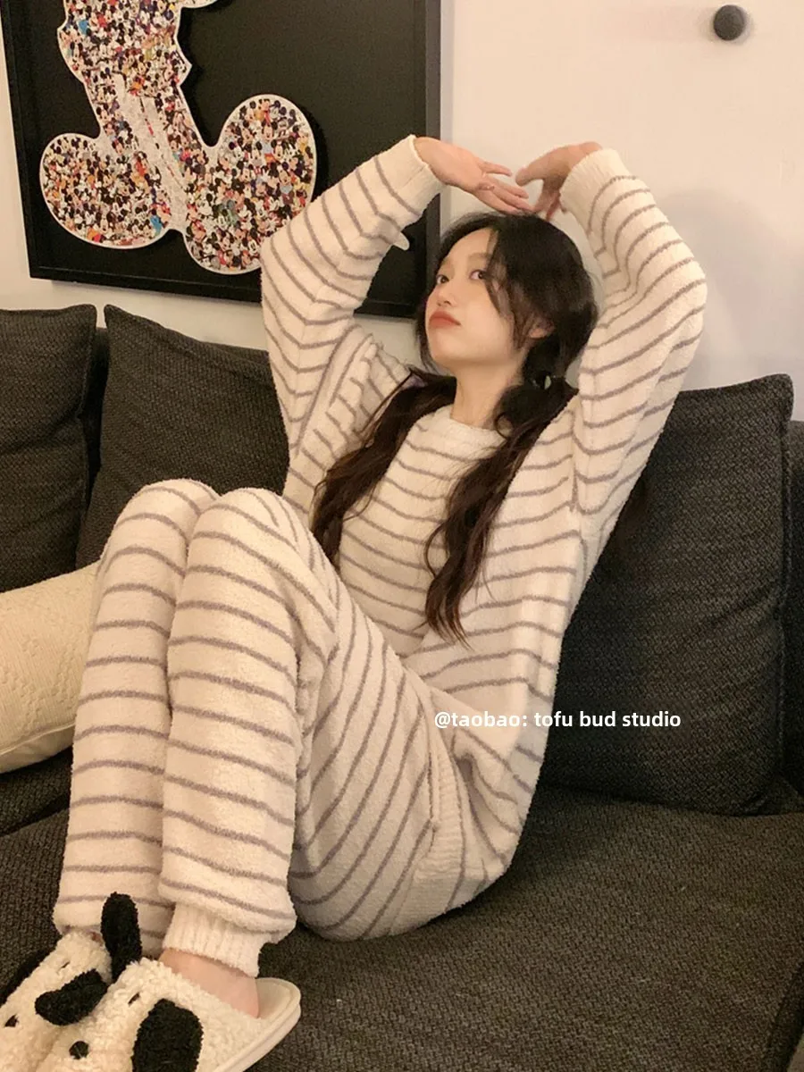 Warm Thickened Coral Fleece Pajamas Women’s Long Sleeve Fluffy Home Clothes Set Sweet Simple Sle Winter Sleepwear