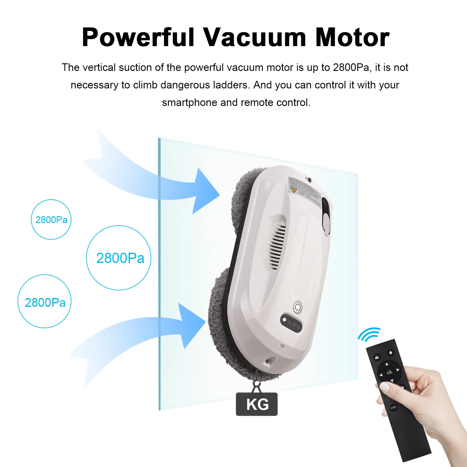The vertical suction of the powerful vacuum motor is up to 2800Pa, it is not necessary to climb dangerous ladders, automatic detection of window frames and obstacles, intelligent calculation path, professional safety rope, another 25 minutes of absorption protection when switched off.