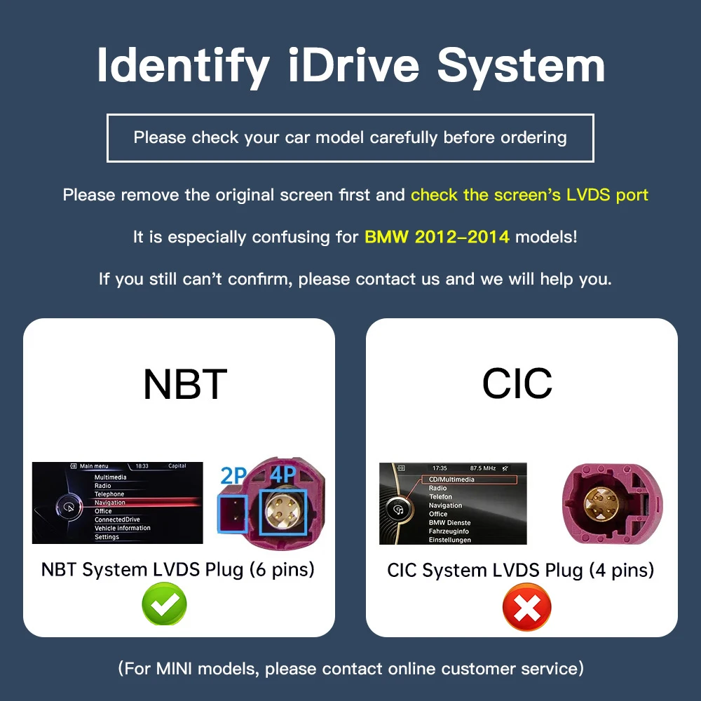 Please note: it is difficult to distinguish the system for 12-13 model year cars, be sure to disassemble the head unit to verify the LVDS pins, NBT is 6 pins, CIC has 4 pins.