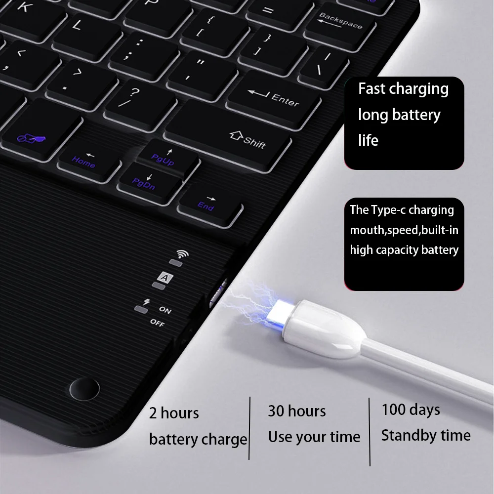 The universal wireless bluetooth keyboard uses built-in lithium battery, can be easily recharged through USB cable, no need to change the battery. The Built-in Rechargeable battery is incredibly long-lasting, standby time is about 6 months between charges. The bluetooth wireless keyboard can automatically enter into sleep mode in order to save energy.